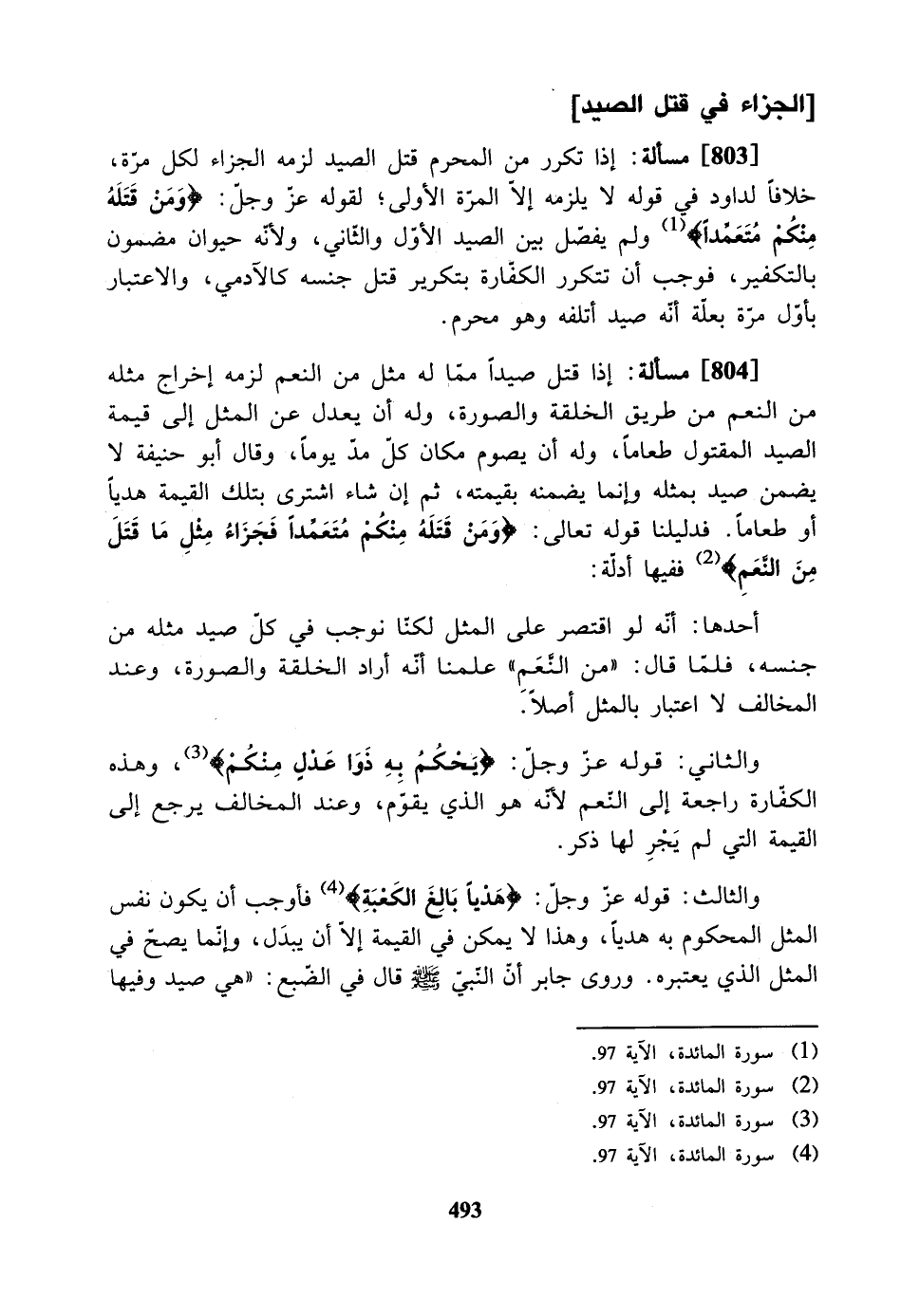 [803] مسألة: إذا تكرر من المحرم قتل الصيد لزمه الجزاء لكل مرة، خلافاً لداود في قوله لا يلزمه إلا المرة الأولى، لقوله عز وجل: {ومن قتله منكم متعمدا}، ولم يفصّل بين الصيد الأول والثاني؛ ولأنه حيوان مضمون بالتكفير، فوجب أن تتكرر الكفارة بتكرير قتل جنسه كالآدمي، والاعتبار بأول مرة بعلة أنه صيد أتلفه وهو محرم.