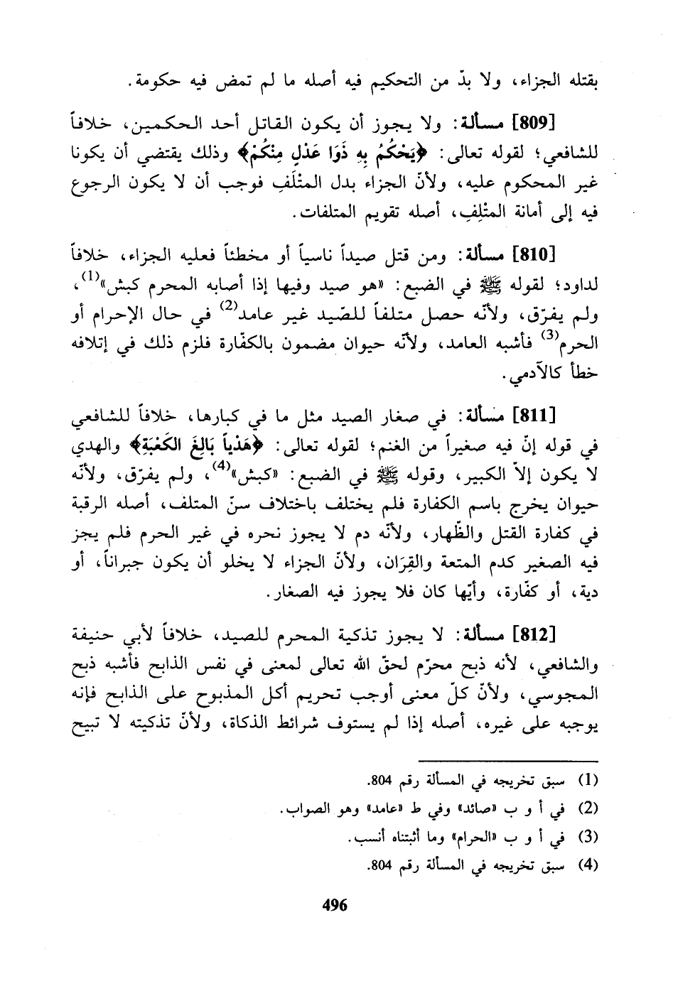 [810] مسألة: ومن قتل صيداً ناسياً أو مخطئاً فعليه الجزاء، خلافاً لداود، لقوله - صلى الله عليه وسلم - في الضبع: (هو صيد وفيها إذا أصابها المحرم كبش) ولم يفرق، ولأنه حصل متلفاً للصيد غير عامد في حال الإحرام أو الحرم فأشبه العامد، ولأنه حيوان مضمون بالكفارة فلزم ذلك في أتلافه خطأ كالآدمي.