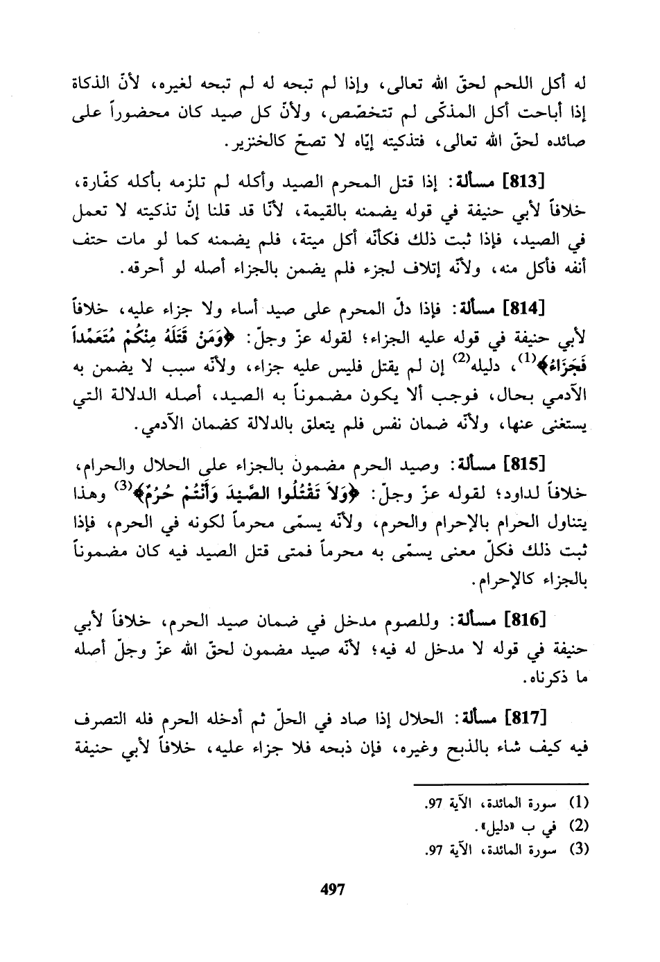 [817] مسألة: الحلال إذا صاد في الحل، ثم أدخله الحرم فله التصرف فيه كيف شاء بالذبح وغيره، فإن ذبحه فلا جزاء عليه. خلافاً لأبي حنيفة