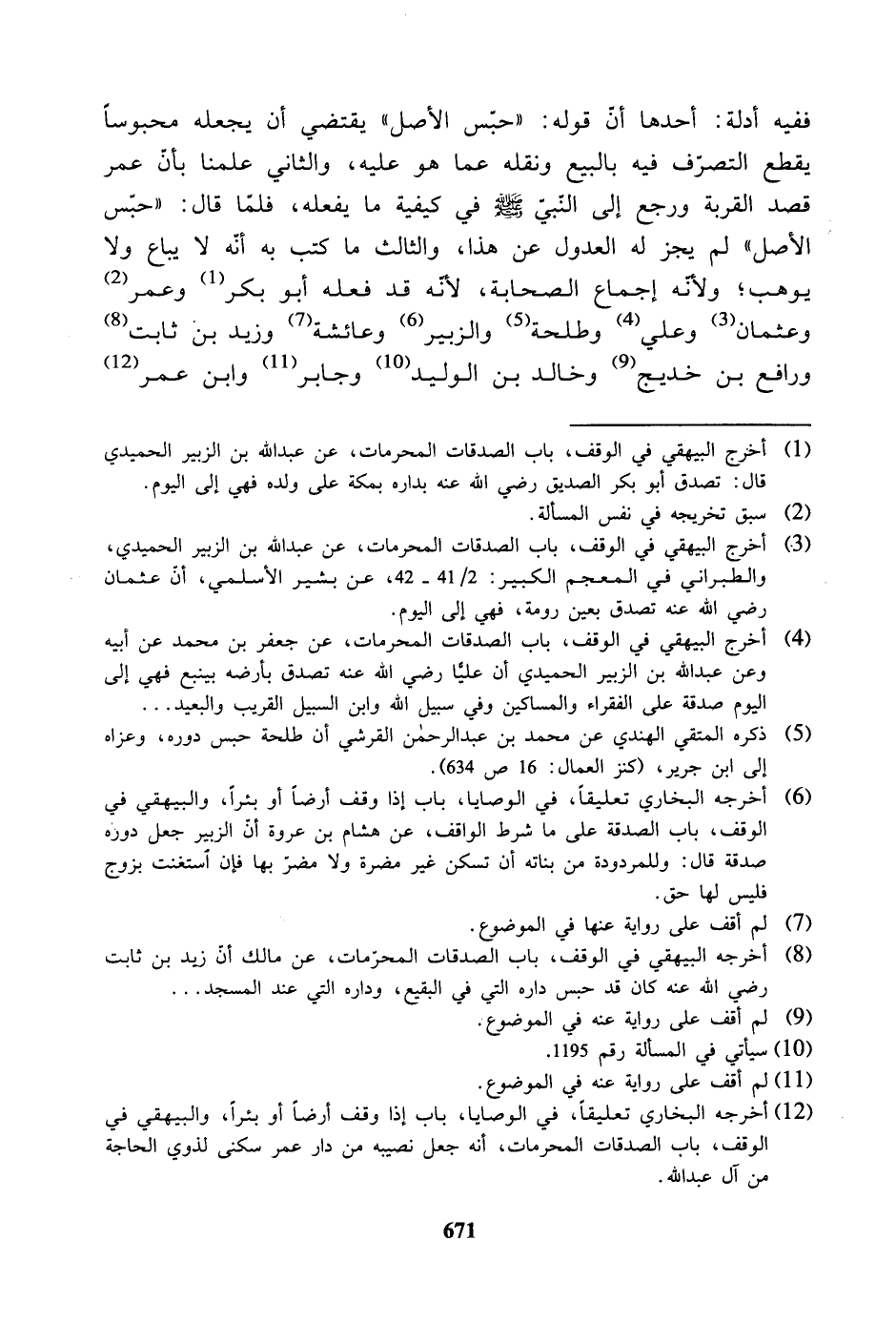 ففيه أدلة: أحدها أن قوله: "حبس الأصل" يقتضي أن يجعله محبوسًا يقطع التصرف فيه بالبيع ونقله عما هو عليه، والثاني علمنا بأنَّ عمر قصد القربة ورجع إلى النبي -صلى الله عليه وسلم- في كيفية ما يفعله، فلما قال: "حبس الأصل " لم يجز له العدول عن هذا، والثالث ما كتب به أنه لا يباع ولا يوهب؛ ولأنه إجماع الصحابة، لأنه قد فعله أبو بكر وعمر وعثمان وعلي وطلحة والزبير وعائشة وزيد بن ثابت ورافع بن خديج وخالد بن الوليد وجابر وابن عمر