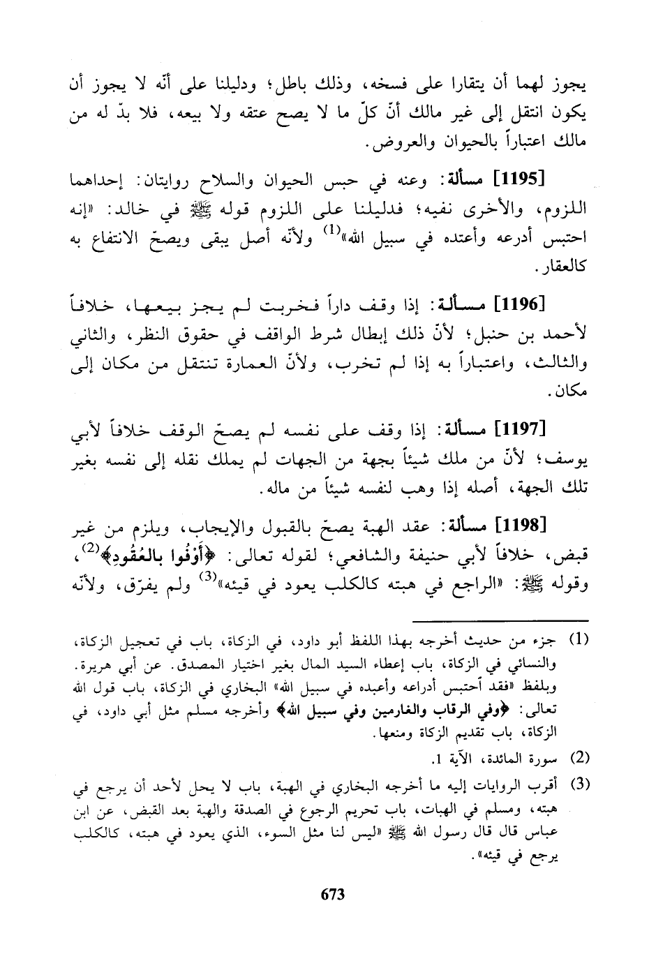 [1195] مسالة: وعنه في حبس الحيوان والسلاح روايتان: إحداهما اللزوم، والأخرى نفيه؛ فدليلنا على اللزوم قوله -صلى الله عليه وسلم- في خالد: "إنه احتبس أدرعه وأعتده في سبيل الله" ولأنه أصل يبقى ويصح الانتفاع به كالعقار.