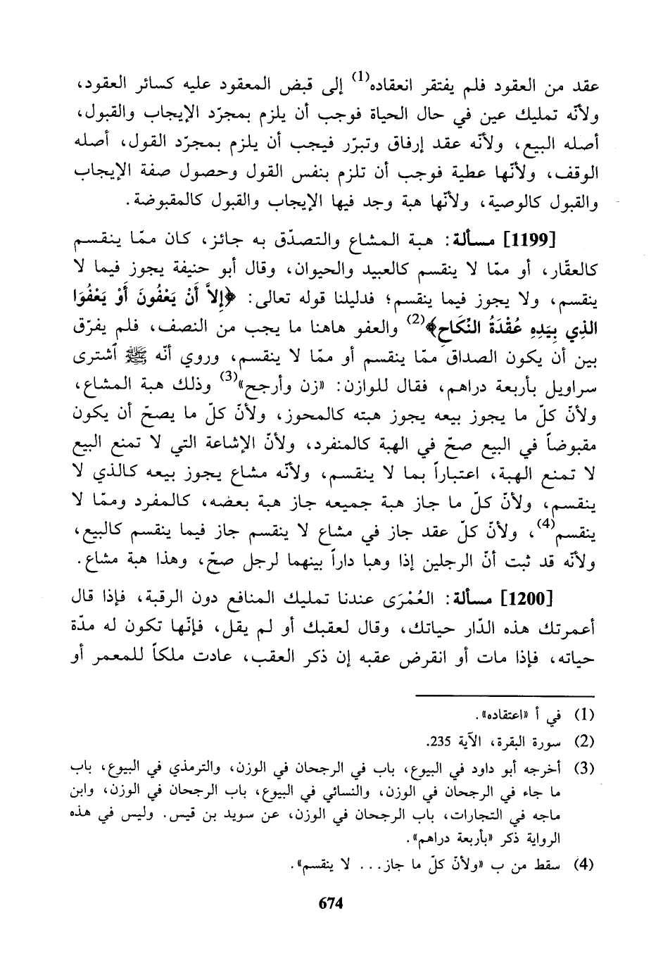 [1199] مسألة: هبة المشاع والتصدق به جائز، كان مما ينقسم كالعقار، أو مما لا ينقسم كالعبيد والحيوان، وقال أبو حنيفة يجوز فيما لا ينقسم، ولا يجوز فيما ينقسم؛ فدليلنا قوله تعالى: "إلا أن يعفون أو يعفو الذي بيده عقدة النكاح" والعفو ها هنا ما يجب من النصف، فلم يفرّق بين أن يكون الصداق مما ينقسم أو مما لا ينقسم، وروي أنه -صلى الله عليه وسلم- اشترى سراويل بأربعة دراهم، فقال للوازن: " زن وأرجح " وذلك هبة المشاع، ولأنَّ كل ما يجوز بيعه يجوز هبته كالمحوز، ولأن كل ما يصح أن يكون مقبوضًا في البيع صح في الهبة كالمنفرد، ولأن الإشاعة التي لا تمنع البيع لا تمنع الهبة، اعتبارًا بما لا ينقسم، ولأنه مشاع يجوز بيعه كالذي لا ينقسم، ولأن كل ما جاز هبة جميعه جاز هبة بعضه، كالمفرد ومما لا ينقسم، ولأن كل عقد جاز في مشاع لا ينقسم جاز فيما ينقسم كالبيع، ولأنه قد ثبت أن الرجلين إذا وهبا دارًا بينهما لرجل صح، وهذا هبة مشاع.
