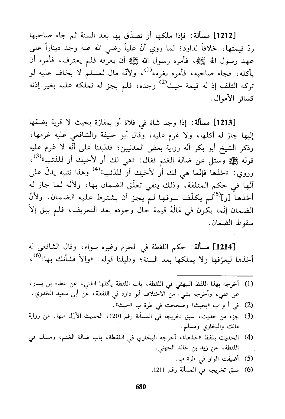 [1213] مسألة: إذا وجد شاة في فلاة أو بمفازة بحيث لا قرية يضمّها إليها جاز له أكلها، ولا غرم عليه، وقال أبو حنيفة والشافعي عليه غرمها، وذكر الشيخ أبو بكر أنّه رواية بعض المدنيين؛ فدليلنا على أنه لا غرم عليه قوله -صلى الله عليه وسلم- وسئل عن ضالة الغنم فقال: " هي لك أو لأخيك أو للذئب "، وروي: " خذها فإنما هي لك أو لأخيك أو للذئب " وهذا تنبيه يدل على أنها في حكم المتلفة، وذلك ينفي تعلق الضمان بها، ولأنّه لما جاز له أخذها [و] لم يكلف سوقها لم يجز أن يشترط عليه الضمان، ولأنّ الضمان إنما يكون في مَالَهُ قيمة حال وجوده بعد التعريف، فلم يبق إلا سقوط الضمان.