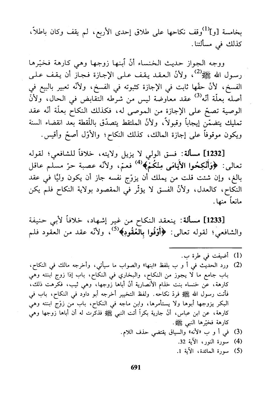 [1233] مسألة: ينعقد النكاح من غير إشهاد، خلافاً لأبي حنيفة والشافعي؛ لقوله تعالى: "وأوفوا بالعقود"، ولأنه عقد من العقود فلم