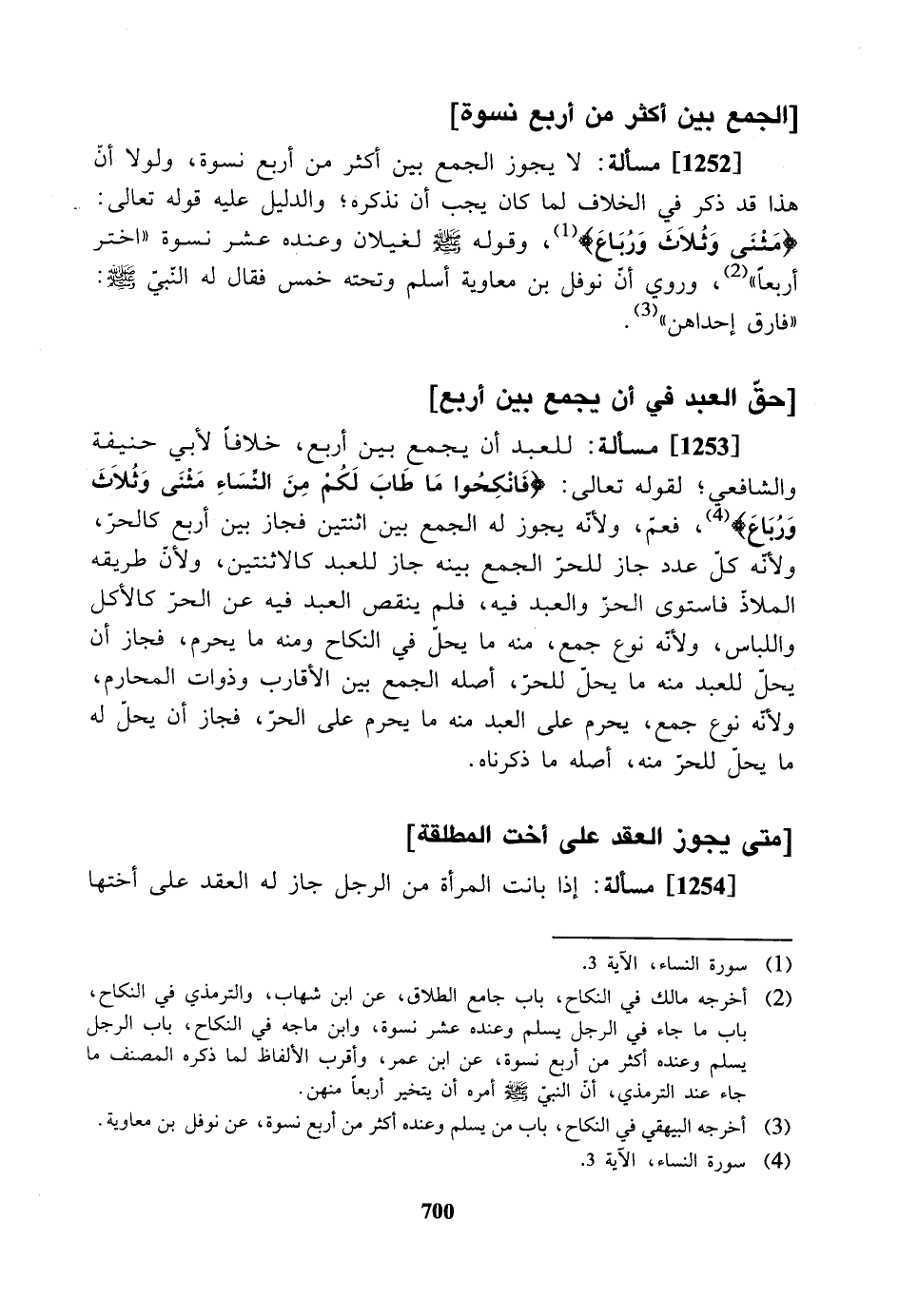 [1253] مسألة: للعبد أن يجمع بين أربع، خلافاً لأبي حنيفة والشافعي؛ لقوله تعالى: " فانكحوا ما طاب لكم من النساء مثنى وثلاث ورباع "، فعم، ولأنه يجوز له الجمع بين اثنتين فجاز بين أربع كالحر، ولأنه كل عدد جاز للحر الجمع بينه جاز للعبد كالاثنتين، ولأن طريقه الملاذ فاستوى الحر والعبد فيه، فلم ينقص العبد فيه عن الحر كالأكل واللباس، ولأنه نوع جمع، منه ما يحل في النكاح ومنه ما يحرم، فجاز أن يحل للعبد منه ما يحل للحر، أصله الجمع بين الأقارب وذوات المحارم، ولأنه نوع جمع، يحرم على العبد منه ما يحرم على الحر، فجاز أن يحل له ما يحل للحر منه، أصله ما ذكرناه.