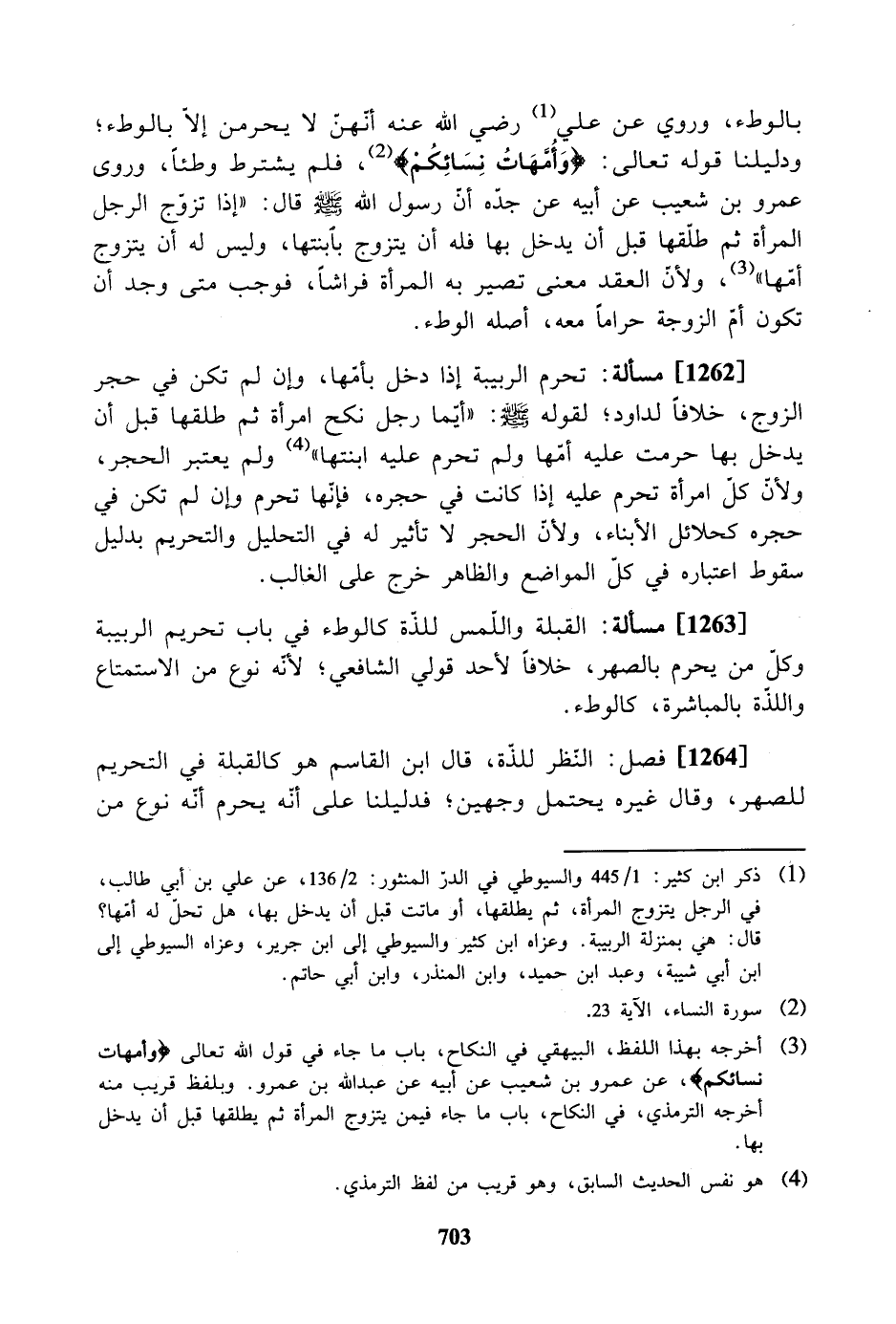 [1262] مسألة: تحرم الربيبة إذا دخل بأمها، وإن لم تكن في حجر الزوج، خلافاً لداود؛ لقوله صلى الله عليه وسلم: " أيما رجل نكح امرأة ثم طلقها قبل أن يدخل بها حرمت عليه أمها ولم تحرم عليه ابنتها " ولم يعتبر الحجر، ولأن كل امرأة تحرم عليه إذا كانت في حجره، فإنها تحرم وإن لم تكن في حجره كحلائل الأبناء، ولأن الحجر لا تأثير له في التحليل والتحريم بدليل سقوط اعتباره في كل المواضع والظاهر خرج على الغالب.