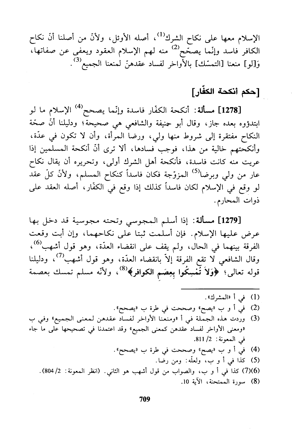 [1278] مسألة: أنكحة الكفار فاسدة وإنما يصحح الإسلام ما لو ابتدؤوه بعده جاز، وقال أبو حنيفة والشافعي هي صحيحة؛ ودليلنا أن صحة النكاح مفتقرة إلى شروط منها ولي، ورضا المرأة، وأن لا تكون في عدة، وأنكحتهم خالية من هذا، فوجب فسادها، ألا ترى أن أنكحة المسلمين إذا عريت منه كانت فاسدة، فأنكحة أهل الشرك أولى، وتحريره أن يقال نكاح عار من ولي وبرضا المزوجة فكان فاسدًا كنكاح المسلم، ولأن كل عقد لو وقع في الإسلام لكان فاسدًا كذلك إذا وقع في الكفار، أصله العقد على ذوات المحارم.