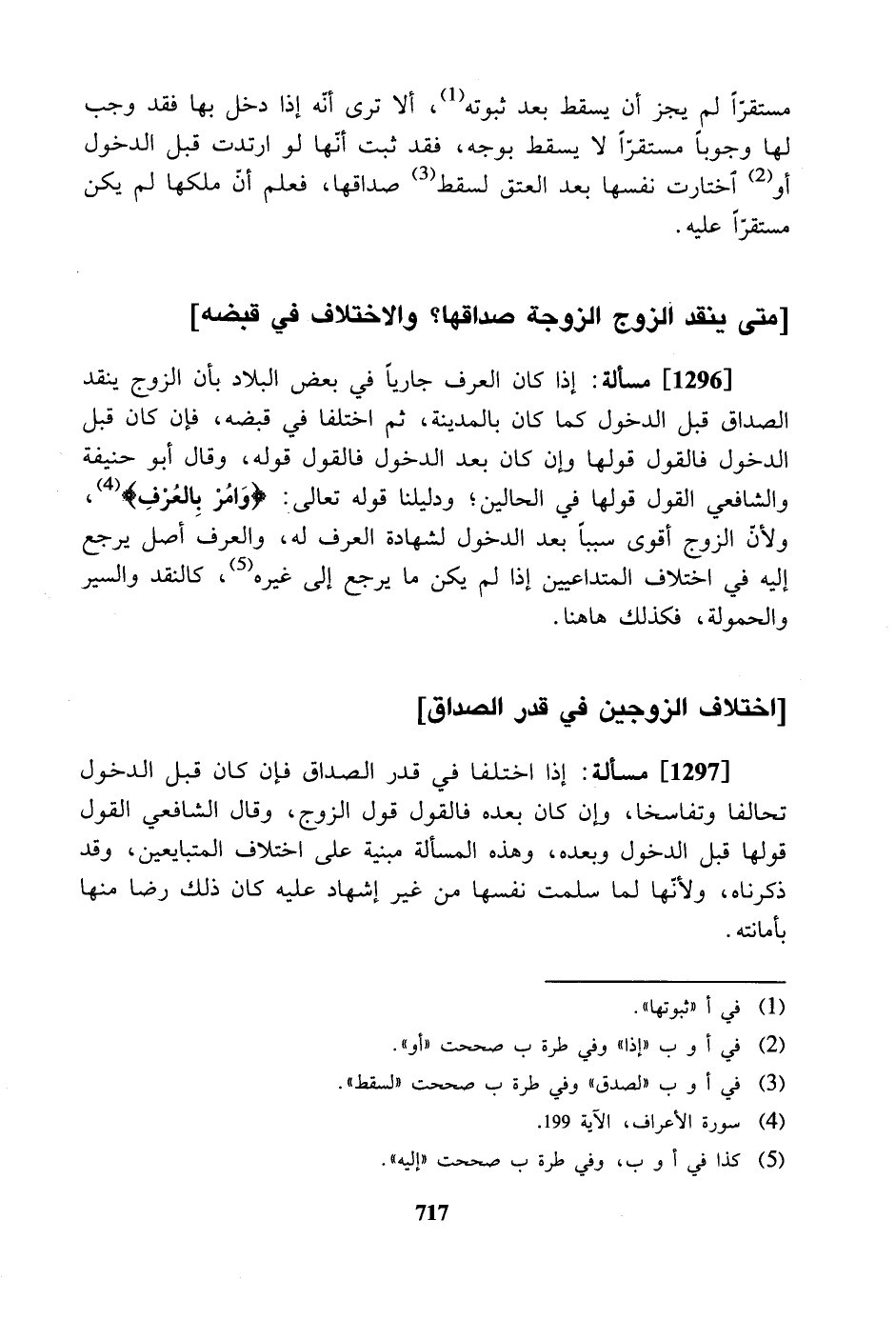 [1296] مسألة: إذا كان العرف جارياً في بعض البلاد بأن الزوج ينقد الصداق قبل الدخول كما كان بالمدينة، ثم اختلفا في قبضه، فإن كان قبل الدخول فالقول قولها وإن كان بعد الدخول فالقول قوله، وقال أبو حنيفة والشافعي القول قولها في الحالين؛ ودليلنا قوله تعالى: " وامر بالعرف "، ولأن الزوج أقوى سبباً بعد الدخول لشهادة العرف له، والعرف أصل يرجع إليه في اختلاف المتداعيين إذا لم يكن ما يرجع إلى غيره، كالنقد والسير والحمولة، فكذلك ها هنا.
