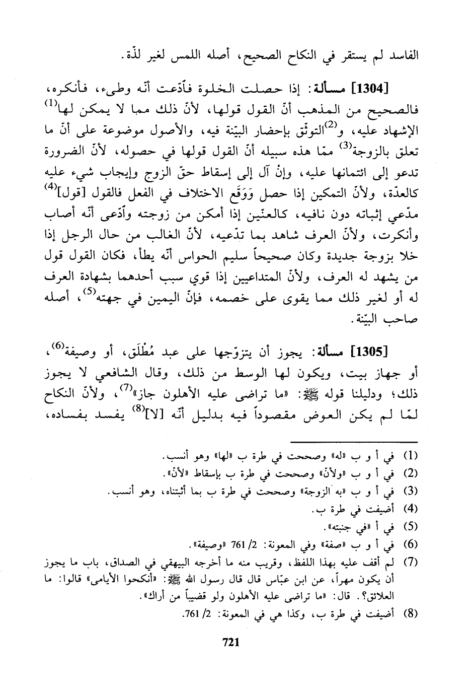 [1304] مسألة: إذا حصلت الخلوة فادعت أنه وطىء، فأنكره، فالصحيح من المذهب أن القول قولها، لأن ذلك مما لا يمكن لها الإشهاد عليه، والتوثق بإحضار البينة فيه، والأصول موضوعة على أن ما تعلق بالزوجة مما هذه سبيله أن القول قولها في حصوله، لأن الضرورة تدعو إلى ائتمانها عليه، وإن آل إلى إسقاط حق الزوج وإيجاب شيء عليه كالعدة، ولأن التمكين إذا حصل ووقع الاختلاف في الفعل فالقول [قول] مدعي إثباته دون نافيه، كالعنين إذا أمكن من زوجته وادعى أنه أصاب وأنكرت، ولأن العرف شاهد بما تدعيه، لأن الغالب من حال الرجل إذا خلا بزوجة جديدة وكان صحيحاً سليم الحواس أنه يطأ، فكان القول قول من يشهد له العرف، ولأن المتداعيين إذا قوي سبب أحدهما بشهادة العرف له أو لغير ذلك مما يقوى على خصمه، فإن اليمين في جهته، أصله صاحب البينة.