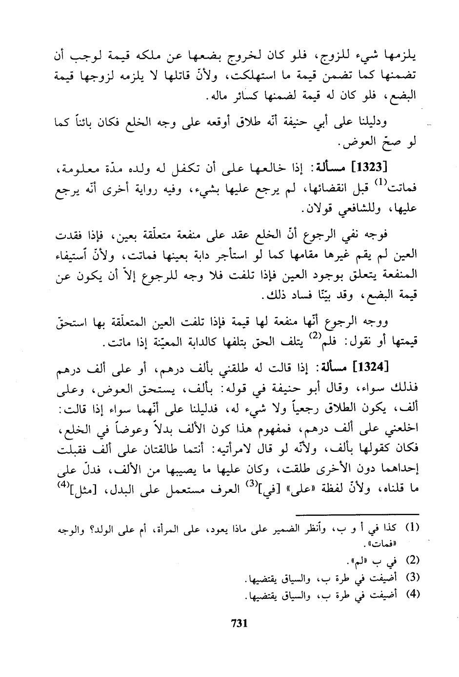 [1323] مسألة: إذا خالعها على أن تكفل له ولده مدة معلومة، فماتت قبل انقضائها، لم يرجع عليها بشيء، وفيه رواية أخرى أنه يرجع عليها، وللشافعي قولان.