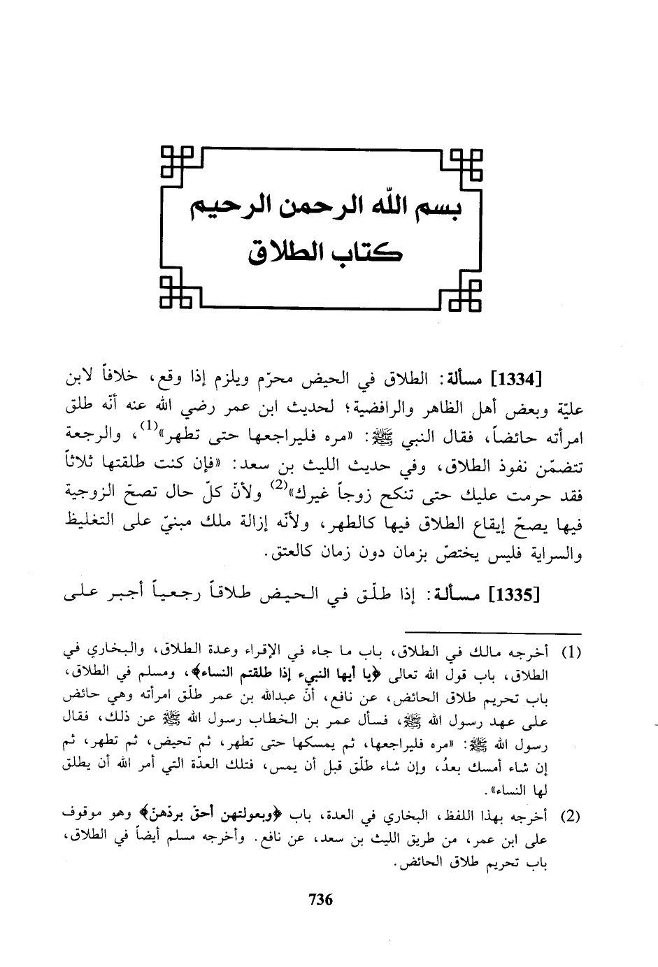 [1334] مسألة: الطلاق في الحيض محرم ويلزم إذا وقع، خلافاً لابن علية وبعض أهل الظاهر والرافضية؛ لحديث ابن عمر رضي الله عنه أنه طلق امرأته حائضًا، فقال النبي صلى الله عليه وسلم: " مره فليراجعها حتى تطهر"، والرجعة تتضمن نفوذ الطلاق، وفي حديث الليث بن سعد: " فإن كنت طلقتها ثلاثاً فقد حرمت عليك حتى تنكح زوجًا غيرك " ولأن كل حال تصح الزوجية فيها يصح إيقاع الطلاق فيها كالطهر، ولأنه إزالة ملك مبني على التغليظ والسراية فليس يختص بزمان دون زمان كالعتق.