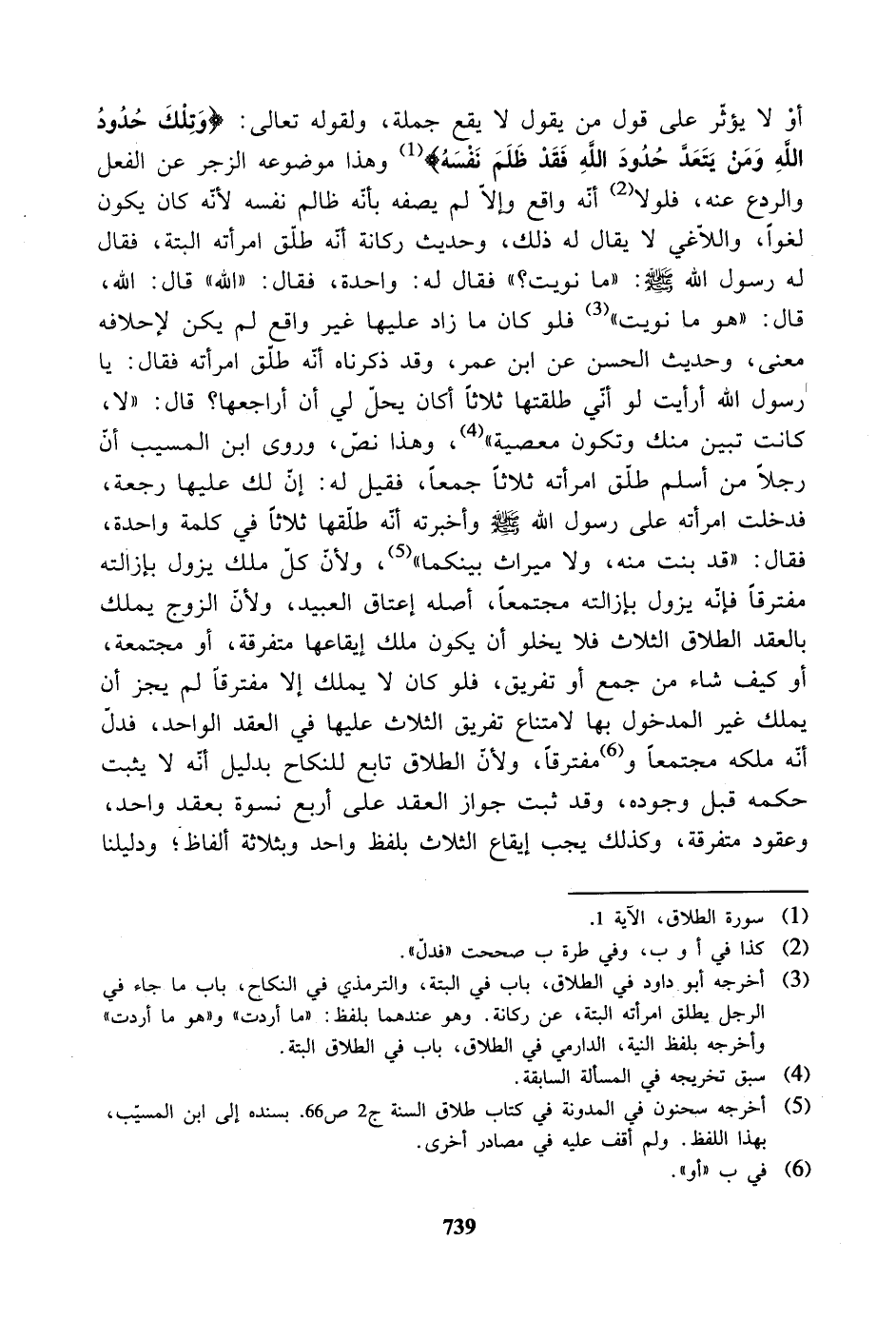 أو لا يؤثر على قول من يقول لا يقع جملة، ولقوله تعالى: " وتلك حدود الله ومن يتعد حدود الله فقذ ظلم نفسه " وهذا موضوعه الزجر عن الفعل والردع عنه، فلولا أنه واقع وإلا لم يصفه بأنه ظالم نفسه لأنه كان يكون لغوًا، واللاغي لا يقال له ذلك، وحديث ركانة أنه طلق امرأته البتة، فقال له رسول الله صلى الله عليه وسلم: " ما نويت؟ " فقال له: واحدة، فقال: " الله " قال: الله، قال: " هو ما نويت " فلو كان ما زاد عليها غير واقع لم يكن لإحلافه معنى، وحديث الحسن عن ابن عمر، وقد ذكرناه أنه طلق امرأته فقال: يا رسول الله أرأيت لو أني طلقتها ثلاثاً أكان يحل لي أن أراجعها؟ قال: " لا، كانت تبين منك وتكون معصية "، وهذا نص، وروى ابن المسيب أن رجلاً من أسلم طلق امرأته ثلاثاً جمعًا، فقيل له: إن لك عليها رجعة، فدخلت امرأته على رسول الله صلى الله عليه وسلم وأخبرته أنه طلقها ثلاثاً في كلمة واحدة، فقال: " قد بنت منه، ولا ميراث بينكما "، ولأن كل ملك يزول بإزالته مفترقاً فإنه يزول بإزالته مجتمعًا، أصله إعتاق العبيد، ولأن الزوج يملك بالعقد الطلاق الثلاث فلا يخلو أن يكون ملك إيقاعها متفرقة، أو مجتمعة، أو كيف شاء من جمع أو تفريق، فلو كان لا يملك إلا مفترقاً لم يجز أن يملك غير المدخول بها لامتناع تفريق الثلاث عليها في العقد الواحد، فدل أنه ملكه مجتمعاً ومفترقاً، ولأن الطلاق تابع للنكاح بدليل أنه لا يثبت حكمه قبل وجوده، وقد ثبت جواز العقد على أربع نسوة بعقد واحد، وعقود متفرقة، وكذلك يجب إيقاع الثلاث بلفظ واحد وبثلاثة ألفاظ؛ ودليلنا
