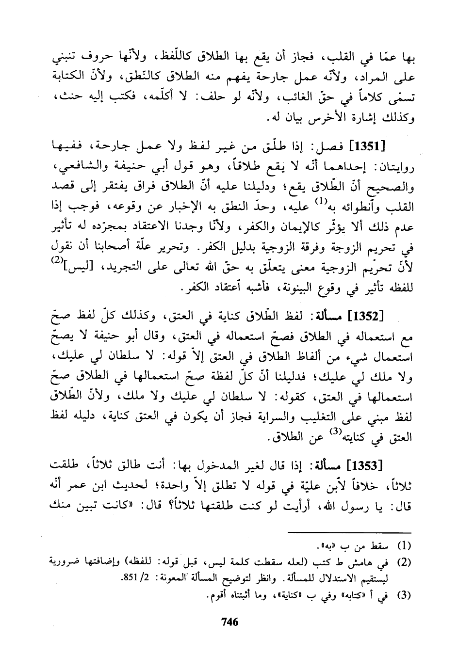[1351] فصل: إذا طلق من غير لفظ ولا عمل جارحة، ففيها روايتان: إحداهما أنه لا يقع طلاقاً، وهو قول أبي حنيفة والشافعي، والصحيح أن الطلاق يقع؛ ودليلنا عليه أن الطلاق فراق يفتقر إلى قصد القلب وانطوائه به عليه، وحد النطق به الإخبار عن وقوعه، فوجب إذا عدم ذلك ألا يؤثر كالإيمان والكفر، ولأنّا وجدنا الاعتقاد بمجرده له تأثير في تحريم الزوجة وفرقة الزوجية بدليل الكفر. وتحرير علة أصحابنا أن نقول لأن تحريم الزوجية معنى يتعلق به حق الله تعالى على التجريد، [ليس] للفظه تأثير في وقوع البينونة، فأشبه اعتقاد الكفر.