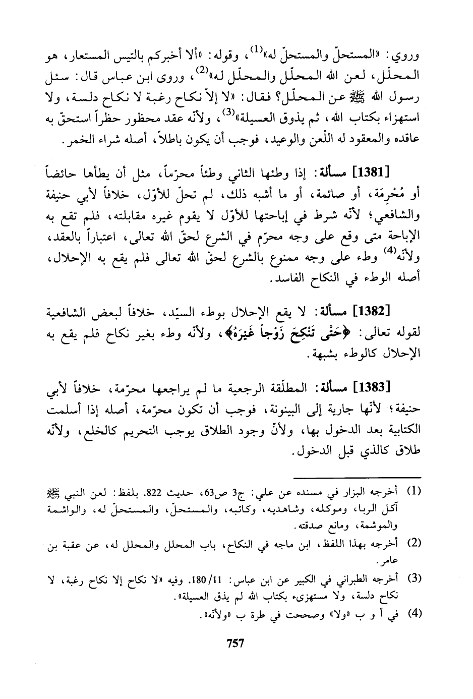 [1381] مسألة: إذا وطئها الثاني وطئاً محرماً، مثل أن يطأها حائضاً أو محرمة، أو صائمة، أو ما أشبه ذلك، لم تحل للأول، خلافاً لأبي حنيفة والشافعي؛ لأنه شرط في إباحتها للأول لا يقوم غيره مقابلته، فلم تقع به الإباحة متى وقع على وجه محرم في الشرع لحق الله تعالى، اعتبارًا بالعقد، ولأنه وطء على وجه ممنوع بالشرع لحق الله تعالى فلم يقع به الإحلال، أصله الوطء في النكاح الفاسد.