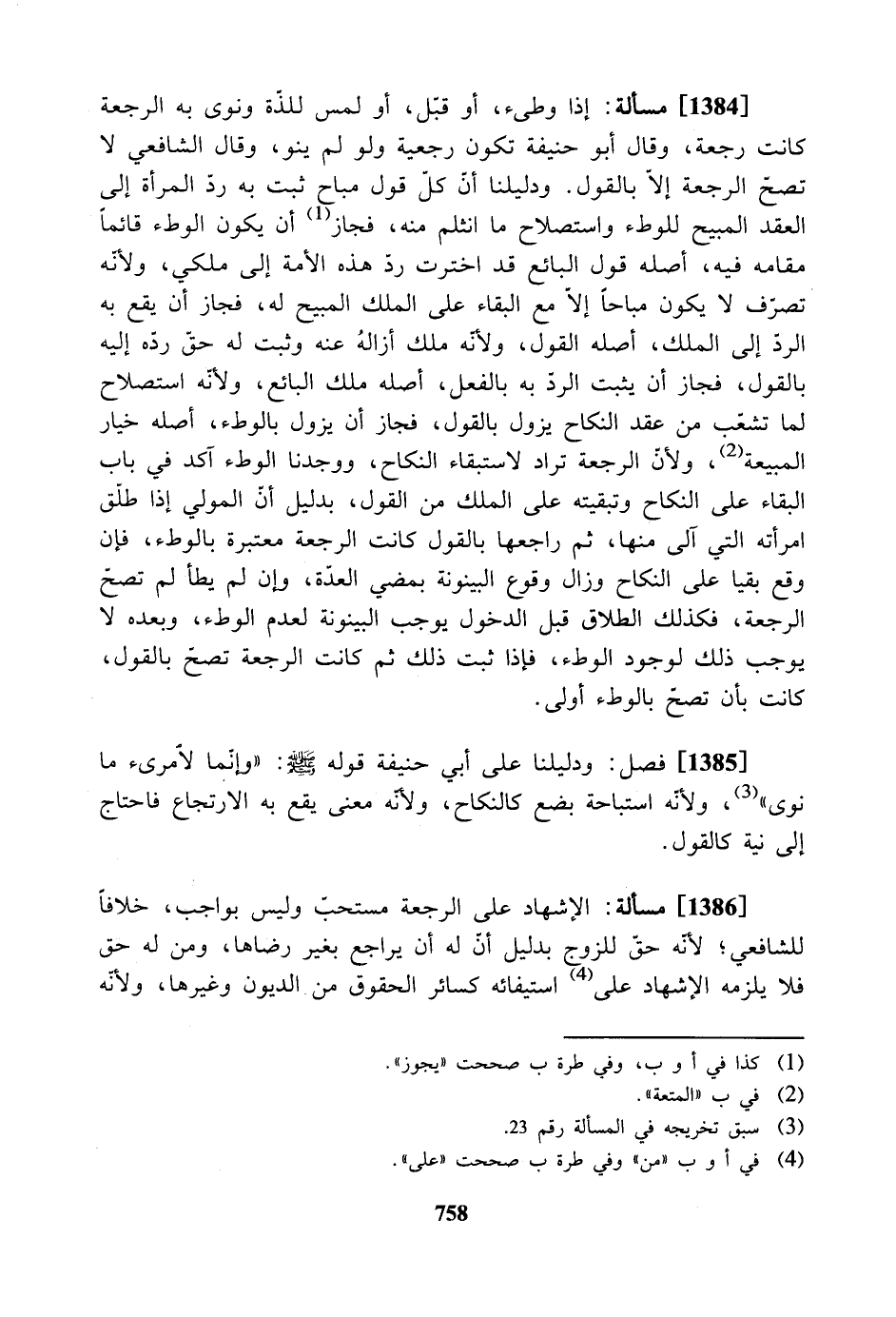 [1384] مسألة: إذا وطىء، أو قبل، أو لمس للذة ونوى به الرجعة كانت رجعة، وقال أبو حنيفة تكون رجعية ولو لم ينو، وقال الشافعي لا تصح الرجعة إلا بالقول. ودليلنا أن كل قول مباح ثبت به رد المرأة إلى العقد المبيح للوطء واستصلاح ما انثلم منه، فجاز أن يكون الوطء قائمًا مقامه فيه، أصله قول البائع قد اخترت رد هذه الأمة إلى ملكي، ولأنه تصرف لا يكون مباحًا إلا مع البقاء على الملك المبيح له، فجاز أن يقع به الرد إلى الملك، أصله القول، ولأنه ملك أزاله عنه وثبت له حق رده إليه بالقول، فجاز أن يثبت الرد به بالفعل، أصله ملك البائع، ولأنه استصلاح لما تشعب من عقد النكاح يزول بالقول، فجاز أن يزول بالوطء، أصله خيار المبيعة، ولأن الرجعة تراد لاستبقاء النكاح، ووجدنا الوطء آكد في باب البقاء على النكاح وتبقيته على الملك من القول، بدليل أن المولي إذا طلق امرأته التي آلى منها، ثم راجعها بالقول كانت الرجعة معتبرة بالوطء، فإن وقع بقيا على النكاح وزال وقوع البينونة بمضي العدة، وإن لم يطأ لم تصح الرجعة، فكذلك الطلاق قبل الدخول يوجب البينونة لعدم الوطء، وبعده لا يوجب ذلك لوجود الوطء، فإذا ثبت ذلك ثم كانت الرجعة تصح بالقول، كانت بأن تصح بالوطء أولى.