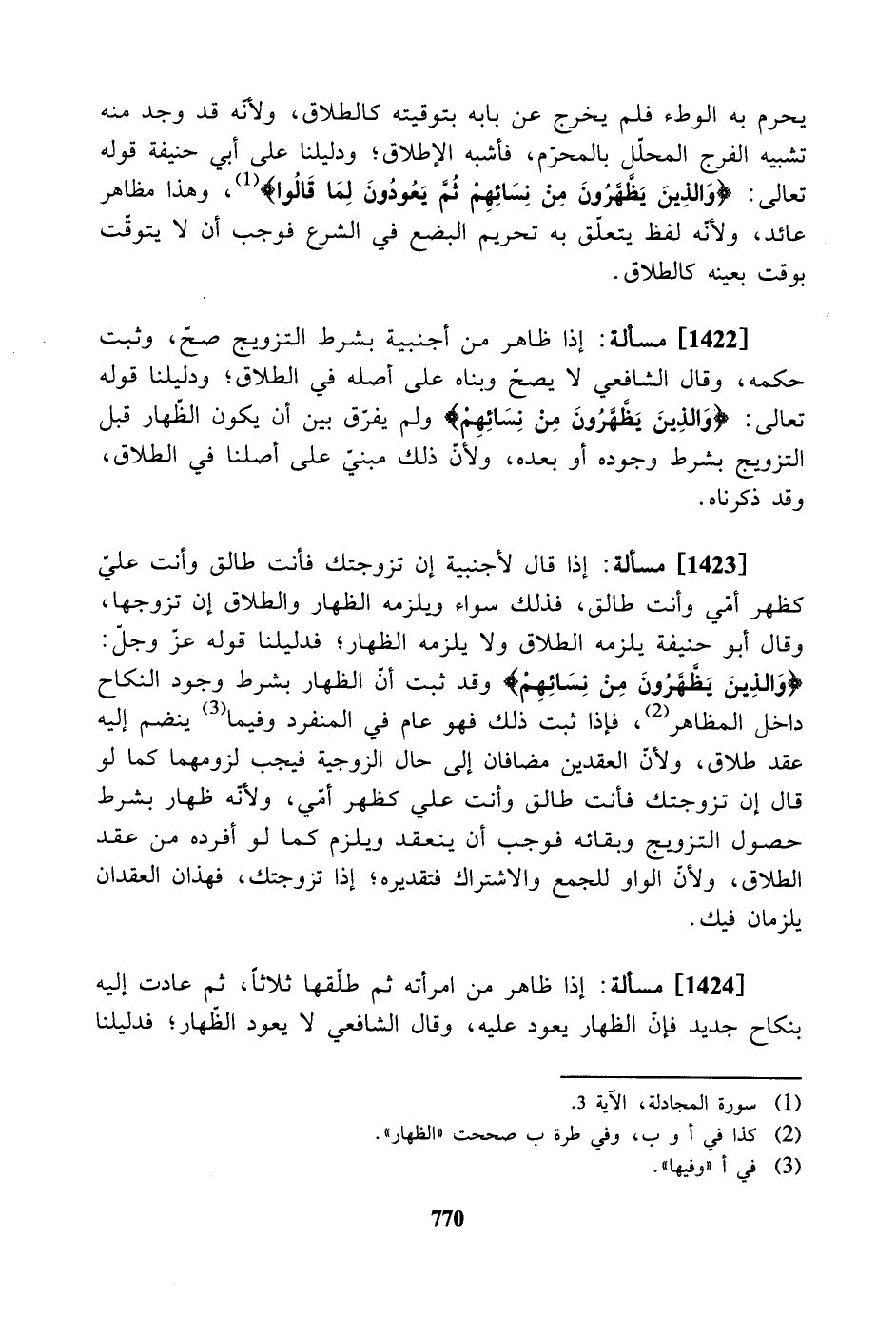 [1424] مسألة: إذا ظاهر من امرأته ثم طلَّقها ثلاثاً، ثم عادت إليه بنكاح جديد فإنَّ الظهار يعود عليه، وقال الشافعي لا يعود الظهار؛ فدليلنا