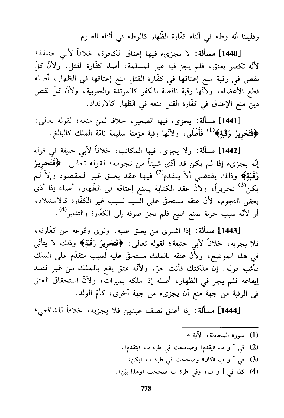 [1442] مسألة: ولا يجزىء فيها المكاتب، خلافاً لأبي حنيفة في قوله إنه يجزىء إذا لم يكن قد أذى شيئا من نجومه؛ لقوله تعالى: " فتحرير رقبة " وذلك يقتضي ألا يتقدم فيها عقد بعتق غير المقصود وإلا لم يكن تحريرًا، ولأن عقد الكتابة يمنع إعتاقه في الظهار، أصله إذا أدَّى بعض النجوم، لأن عتقه مستحق على السيد لسبب غير الكفارة كالاستيلاد، أو لأنه سبب حرية يمنع البيع فلم يجز صرفه إلى الكفارة والتدبير. [1443] مسألة: اذا اشترى من يعتق عليه، ونوى وقوعه عن كفارته، فلا يجزيه، خلافاً لأبي حنيفة؛ لقوله تعالى: " فتحرير رقبة " وذلك لا يتأتى في هذا الموضع، ولأن عتقه بالملك مستحق عليه لسبب متقدم على الملك فأشبه قوله: إن ملكتك فأنت حر، ولأنه عتق يقع بالملك من غير قصد إيقاعه فلم يجز في الظهار، أصله إذا ملكه بميراث، ولأن استحقاق العتق في الرقبة من جهة منع أن يجزىء من جهة أخرى، كأم الولد.