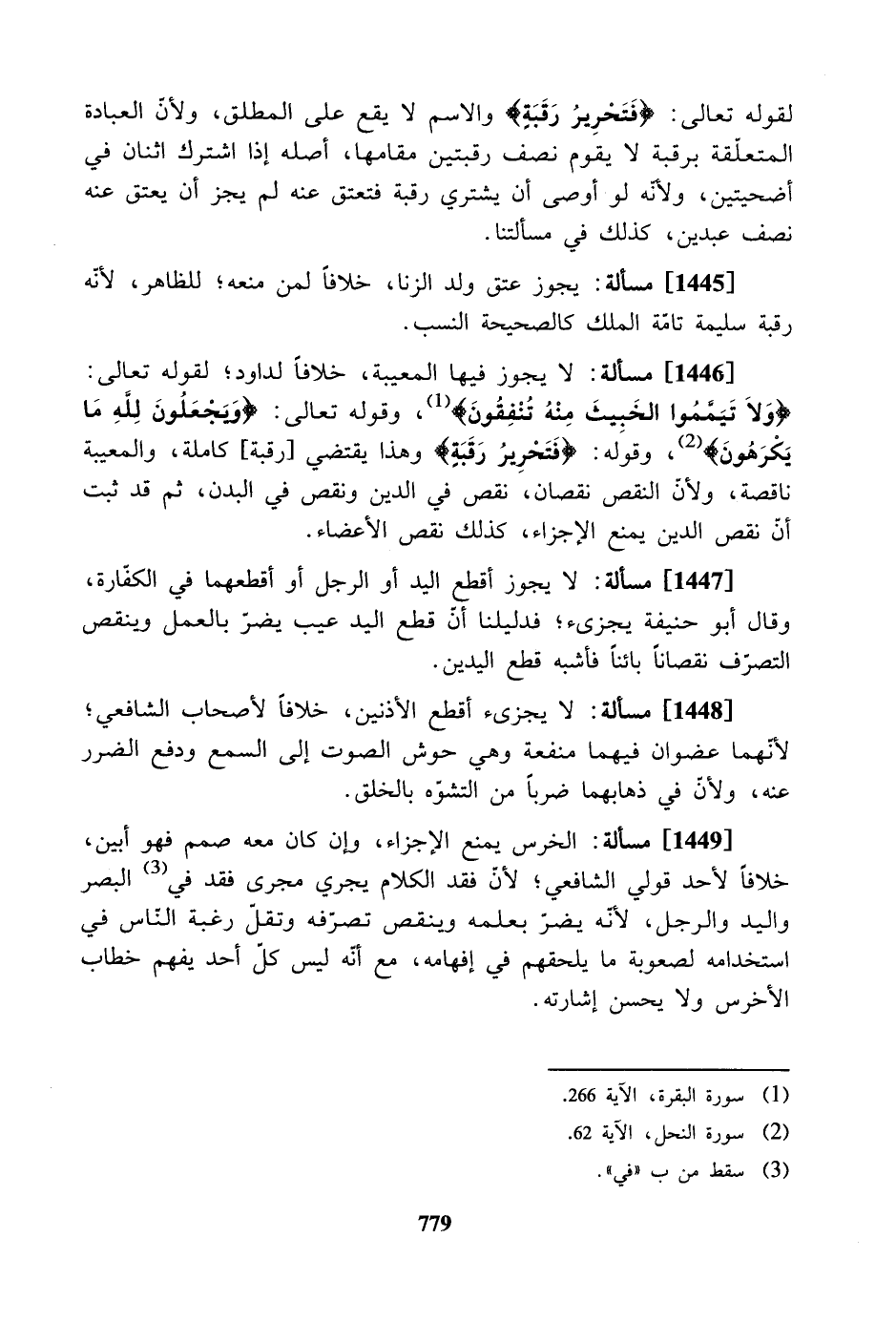 [1446] مسألة: لا يجوز فيها المعيبة، خلافًا لداود؛ لقوله تعالى: " ولا تيمموا الخبيث منه تتفقون "، وقوله تعالى: " ويجعلون لله ما يكرهون "، وقوله: " فتحرير رقبة " وهذا يقتضي [رقبة] كاملة، والمعيبة ناقصة، ولأن النقص نقصان، نقص في الدين ونقص في البدن، ثم قد ثبت أن نقص الدين يمنع الإجزاء، كذلك نقص الأعضاء.