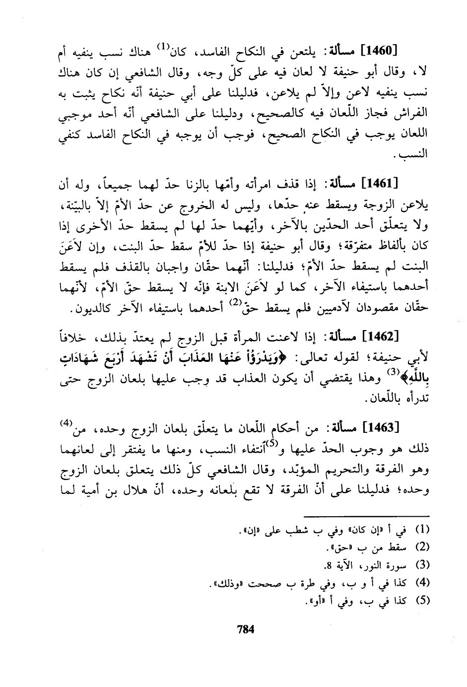 [1460] مسألة: يلتعن في النكاح الفاسد، كان هناك نسب ينفيه أم لا، وقال أبو حنيفة لا لعان فيه على كلِّ وجه، وقال الشافعي إن كان هناك نسب ينفيه لاعن وإلا لم يلاعن، فدليلنا على أبي حنيفة أنَّه نكاح يثبت به الفراش فجاز اللّعان فيه كالصحيح، ودليلنا على الشافعي أنّه أحد موجبي اللعان يوجب في النكاح الصحيح، فوجب أن يوجبه في النكاح الفاسد كنفي النسب.