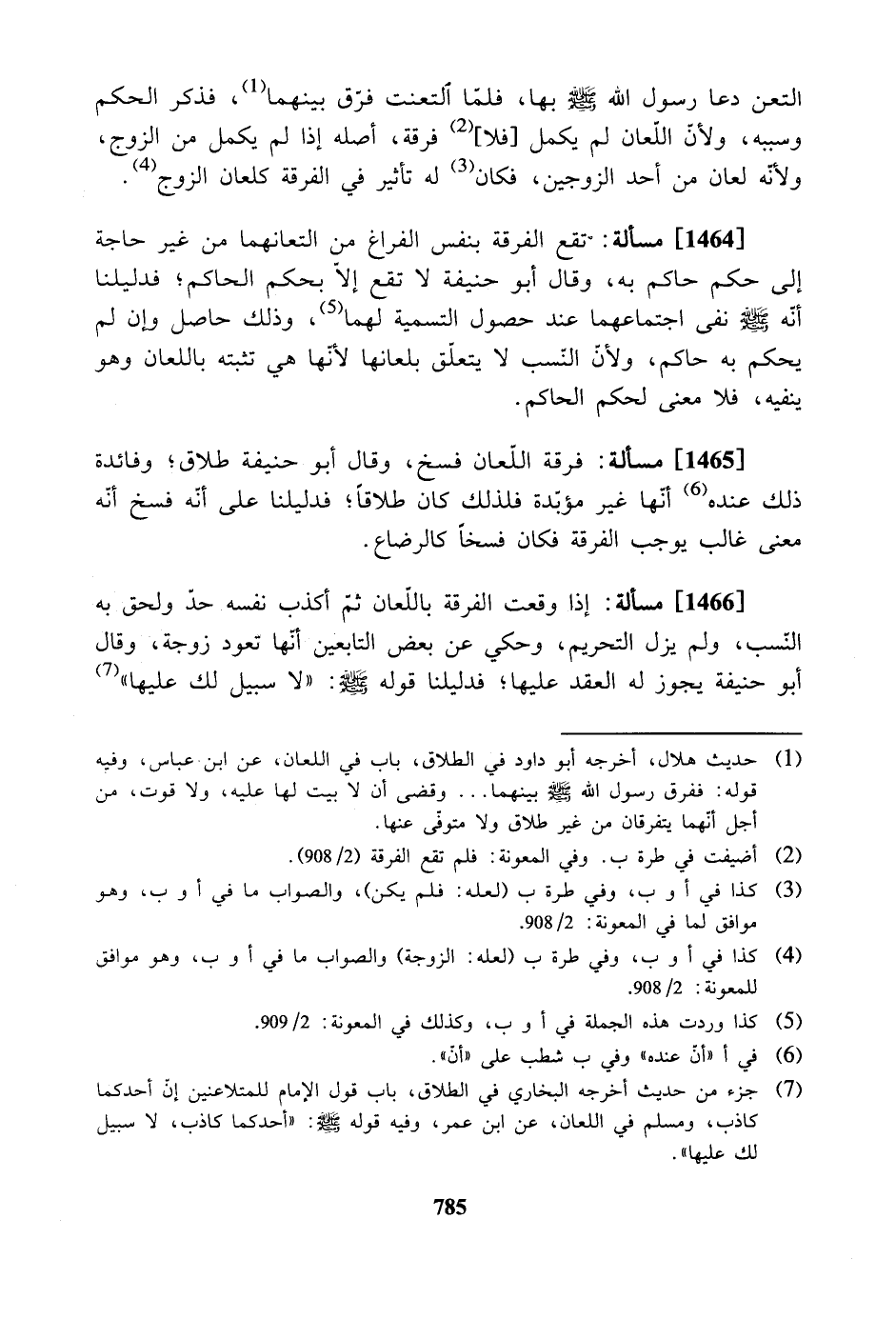 [1464] مسألة: تقع الفرقة بنفس الفراغ من التعانهما من غير حاجة إلى حكم حاكم به، وقال أبو حنيفة لا تقع إلا بحكم الحاكم؛ فدليلنا أنّه صلى الله عليه وسلم نفى اجتماعهما عند حصول التسمية لهما، وذلك حاصل وإن لم يحكم به حاكم، ولأن النسب لا يتعلّق بلعانها لأنها هي تثبته باللعان وهو ينفيه، فلا معنى لحكم الحاكم.