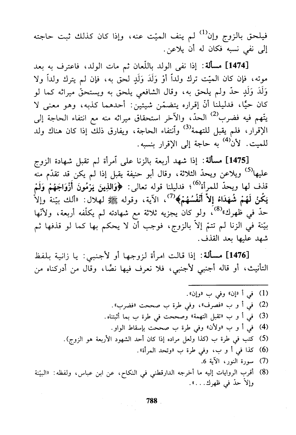 [1474] مسألة: إذا نفى الولد باللّعان ثم مات الولد، فاعترف به بعد موته، فإن كان الميت ترك ولدًا أو ولد ولدٍ لحق به، فإن لم يترك ولدًا ولا ولد ولدٍ حدّ ولم يلحق به، وقال الشافعي يلحق به ويستحق ميراثه كما لو كان حياً، فدليلنا أن إقراره يتضمّن شيئين: أحدهما كذبه، وهو معنى لا يتهم فيه فضرب الحد، والآخر استحقاق ميراثه منه مع انتفاء الحاجة إلى الإقرار، فلم يقبل للتهمة وانتفاء الحاجة، ويفارق ذلك إذا كان هناك ولد للميت. لأن به حاجة إلى الإقرار بنسبه.