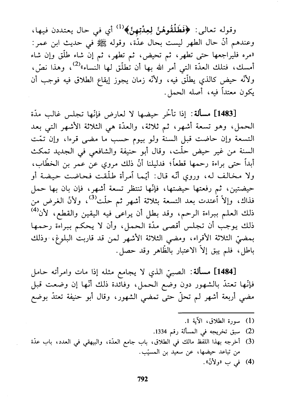 [1483] مسألة: إذا تأخر حيضها لا لعارض فإنها تجلس غالب مدّة الحمل، وهو تسعة أشهر، ثم ثلاثة، والعدّة هي الثلاثة الأشهر التي بعد التسعة وإن حاضت قبل السنة ولو بيوم حسب ما مضى قرءًا، وإن تمّت السنة من غير حيض حلّت، وقال أبو حنيفة والشافعي في الجديد تمكث أبدًا حتى براءة رحمها قطعًا؛ فدليلنا أن ذلك مروي عن عمر بن الخطاب، ولا مخالف له، وروي أنه قال: أيما امرأة طلّقت فحاضت حيضة أو حيضتين، ثم رفعتها حيضتها، فإنها تنتظر تسعة أشهر، فإن بان بها حمل فذاك، وإلا اعتدت بعد التسعة بثلاثة أشهر ثم حلّت، ولأن الغرض من ذلك العلم ببراءة الرحم، وقد بطل أن يراعى فيه اليقين والقطع، لأن ذلك يوجب أن تجلس أقصى مدة الحمل، وأن لا يحكم ببراءة رحمها بمضي الثلاثة الأقراء، ومضي الثلاثة الأشهر لمن قد قاربت البلوغ، وذلك باطل، فلم يبق إلا الاعتبار بالظاهر وقد حصل.
