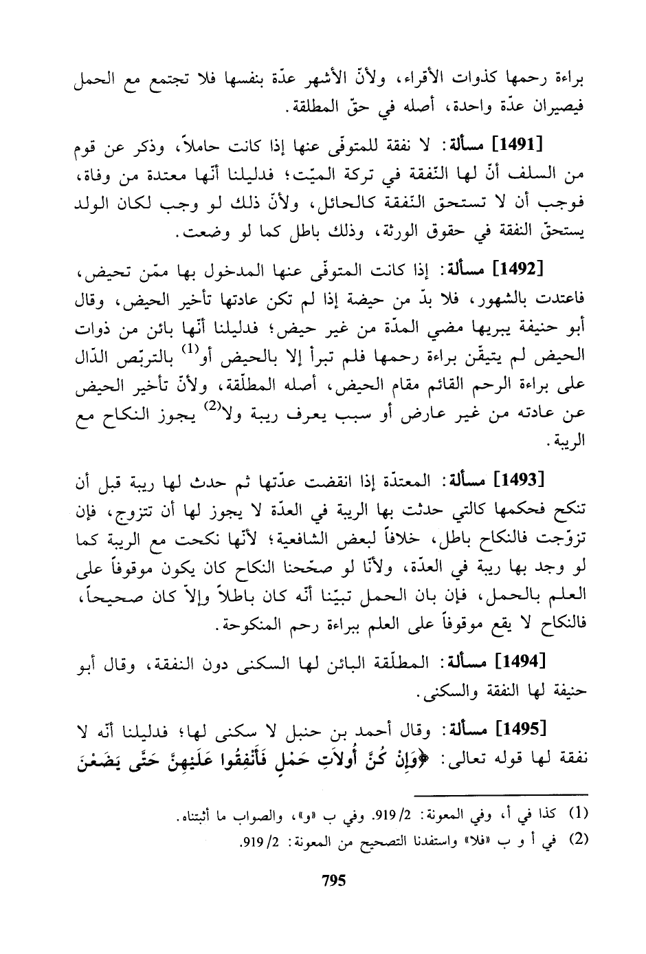 [1491] مسألة: لا نفقة للمتوفى عنها إذا كانت حاملاً، وذكر عن قوم من السلف أن لها النفقة في تركة الميت؛ فدليلنا أنها معتدة من وفاة، فوجب أن لا تستحق النفقة كالحائل، ولأن ذلك لو وجب لكان الولد يستحق النفقة في حقوق الورثة، وذلك باطل كما لو وضعت.