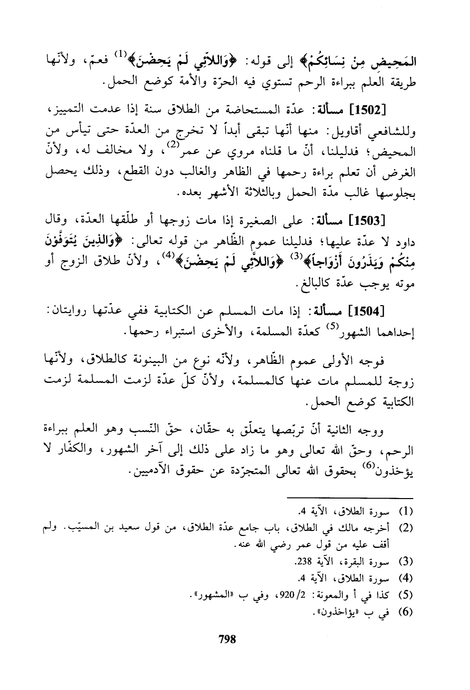 [1502] مسألة: عدّة المستحاضة من الطلاق سنة إذا عدمت التمييز، وللشافعي أقاويل: منها أنّها تبقى أبدًا لا تخرج من العدّة حتى تيأس من المحيض؛ فدليلنا، أن ما قلناه مروي عن عمر، ولا مخالف له، ولأنّ الغرض أن تعلم براءة رحمها في الظاهر والغالب دون القطع، وذلك يحصل بجلوسها غالب مدة الحمل وبالثلاثة الأشهر بعده.