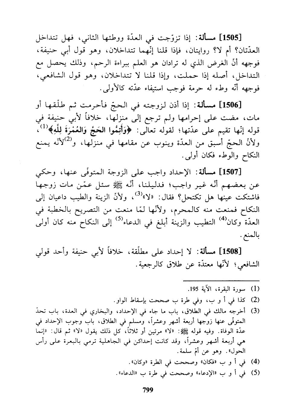 [1506] مسألة: إذا أذن لزوجته في الحج فأحرمت ثم طلقها أو مات، مضت على إحرامها ولم ترجع إلى منزلها، خلافاً لأبي حنيفة في قوله إنها تقيم على عدّتها؛ لقوله تعالى: " وأتموا الحج والعمرة لله "، ولأن الحج أسبق من العدة وينوب عن مقامها في منزلها، ولأنه يمنع النكاح والوطء فكان أولى.