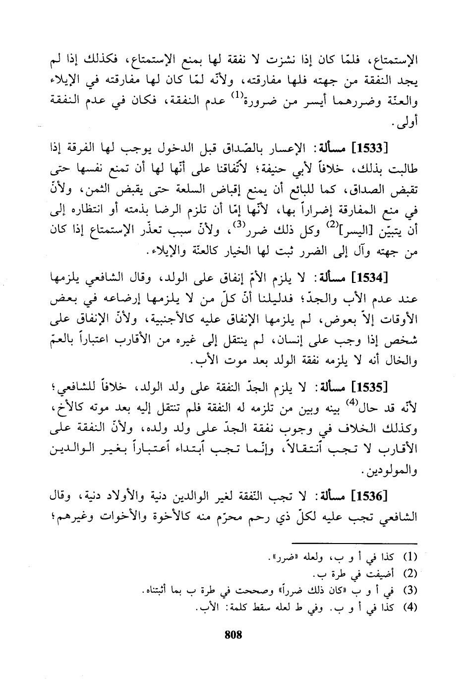 [1536] مسألة: لا تجب النفقة لغير الوالدين دنية والأولاد دنية، وقال الشافعي تجب عليه لكل ذي رحم محرم منه كالأخوة والأخوات وغيرهم؛