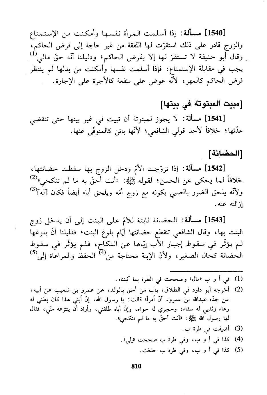 [1541] مسألة: لا يجوز لمبتوتة أن تبيت في غير بيتها حتى تنقضي عدّتها؛ خلافاً لأحد قولي الشافعي؛ لأنها بائن كالمتوفى عنها.