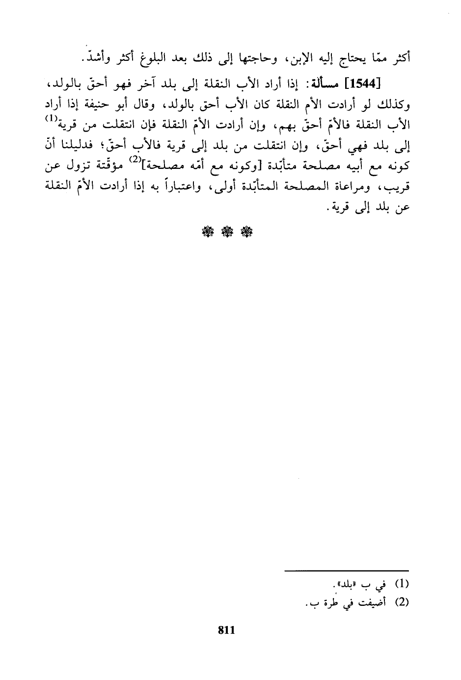 [1544] مسألة: إذا أراد الأب النقلة إلى بلد آخر فهو أحق بالولد، وكذلك لو أرادت الأم النقلة كان الأب أحق بالولد، وقال أبو حنيفة إذا أراد الأب النقلة فالأم أحق بهم، وإن أرادت الأم النقلة فإن انتقلت من قرية إلى بلد فهي أحق، وإن انتقلت من بلد إلى قرية فالأب أحق؛ فدليلنا أن كونه مع أبيه مصلحة متأبدة [وكونه مع أمه مصلحة] مؤقتة تزول عن قريب، ومراعاة المصلحة المتأبدة أولى، واعتبارًا به إذا أرادت الأم النقلة عن بلد إلى قرية.