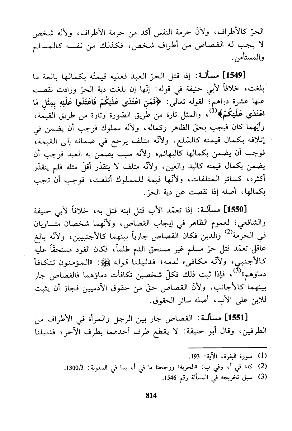 [1550] مسألة: إذا تعمّد الأب قتل ابنه قتل به، خلافاً لأبي حنيفة والشافعي؛ لعموم الظاهر في إيجاب القصاص، ولأنهما شخصان متساويان في الحرمة والدين فكان القصاص جارياً بينهما كالأجنبيين، ولأنه بالغ عاقل تعمّد قتل حر مسلم غير مستحق الدم ظلمًا، فكان القود مستحقاً عليه كالأجنبي، ولأنه مكافىء لدمه؛ فدليلنا قوله صلى الله عليه وسلم: «المؤمنون تتكافأ دماؤهم»، فإذا ثبت ذلك فكل شخصين تكافأت دماؤهما فالقصاص جار بينهما كالأجانب، ولأن القصاص حق من حقوق الآدميين فجاز أن يثبت للابن على الأب، أصله سائر الحقوق.