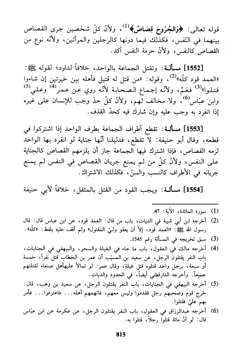 [1552] مسألة: وتقتل الجماعة بالواحد، خلافاً لداود؛ لقوله صلى الله عليه وسلم: «العمد قود كلّه»، وقوله: «من قتل له قتيل فأهله بين خيرتين إن شاءوا قتلوا» فعم، ولأنه إجماع الصحابة لأنه روي عن عمر وعلي وابن عباس، ولا مخالف لهم، ولأنّ كل حد وجب للإنسان على غيره إذا انفرد به وجب عليه وإن شارك فيه كحد القذف.