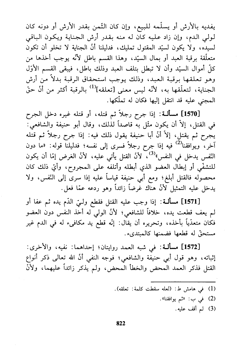 [1570] مسألة: إذا جرح رجلاً ثم قتله، أو قتله غيره دخل الجرح في القتل، إلا أن يكون مثل به قاصدًا لذلك، وقال أبو حنيفة والشافعي: يجرح ثم يقتل، إلا أن أبا حنيفة يقول ذلك فيه: إذا جرح رجلاً ثم قتله آخر، ويوافقنا فيه إذا جرح رجلاً فسرى إلى نفسه؛ فدليلنا قوله: «ما دون النفس يدخل في النفس»، لأن القتل يأتي عليه، لأنّ الغرض إما أن يكون للتشفي أو إبطال العضو الذي أبطله وأتلفه على المجروح، وأي ذلك كان محصوله فالقتل أبلغ؛ ومع أبي حنيفة قياسًا عليه إذا سرى إلى النفس، ولا يدخل عليه التمثيل لأنّ هناك غرضًا زائدًا وهو ردعه عمّا فعل.