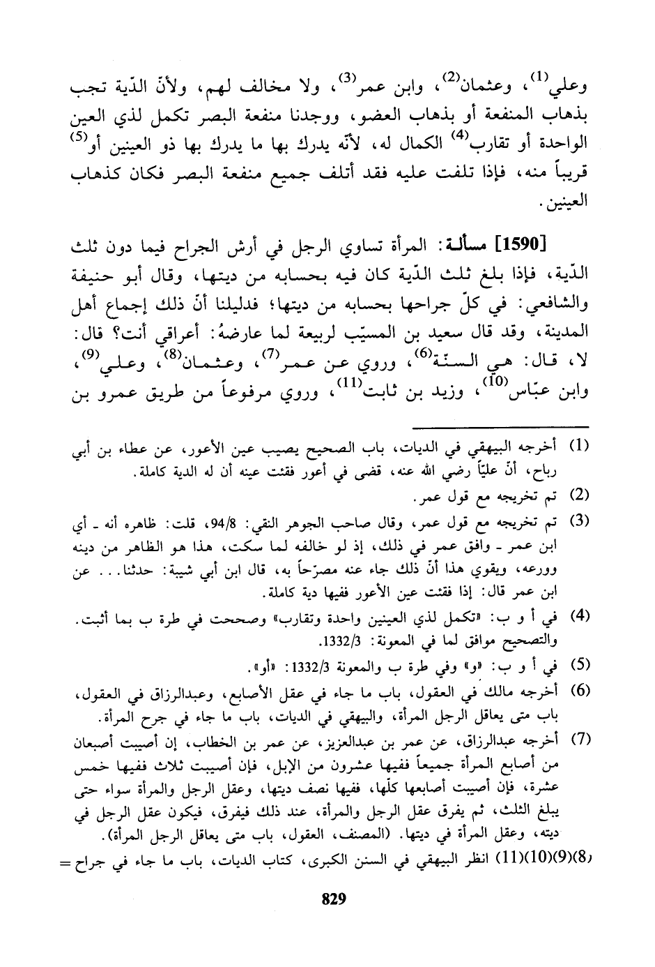 [1590] مسألة: المرأة تساوي الرجل في أرش الجراح فيما دون ثلث الدّية، فإذا بلغ ثلث الدّية كان فيه بحسابه من ديتها، وقال أبو حنيفة والشافعي: في كل جراحها بحسابه من ديتها؛ فدليلنا أن ذلك إجماع أهل المدينة، وقد قال سعيد بن المسيب لربيعة لما عارضه: أعراقي أنت؟ قال: لا، قال: هى السنة، وروي عن عمر، وعثمان، وعلي، وابن عباس، وزيد بن ثابت، وروي مرفوعاً من طريق عمرو بن