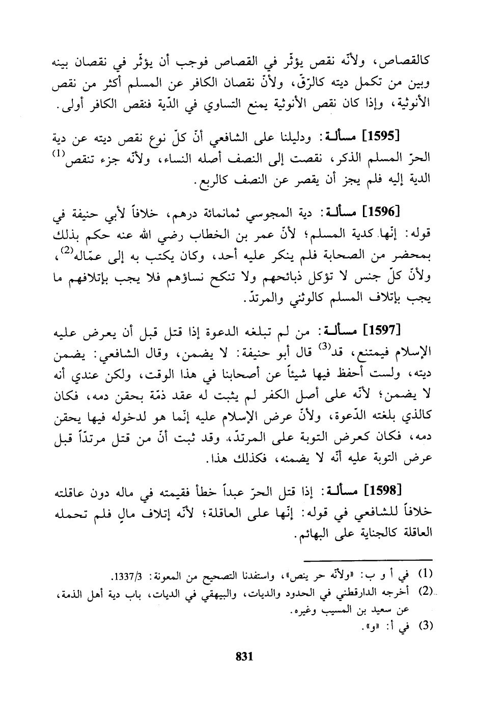 [1595] مسألة: ودليلنا على الشافعي أنّ كل نوع نقص ديته عن دية الحر المسلم الذكر، نقصت إلى النصف أصله النساء، ولأنّه جزء تنقص الدية إليه فلم يجز أن يقصر عن النصف كالربع.