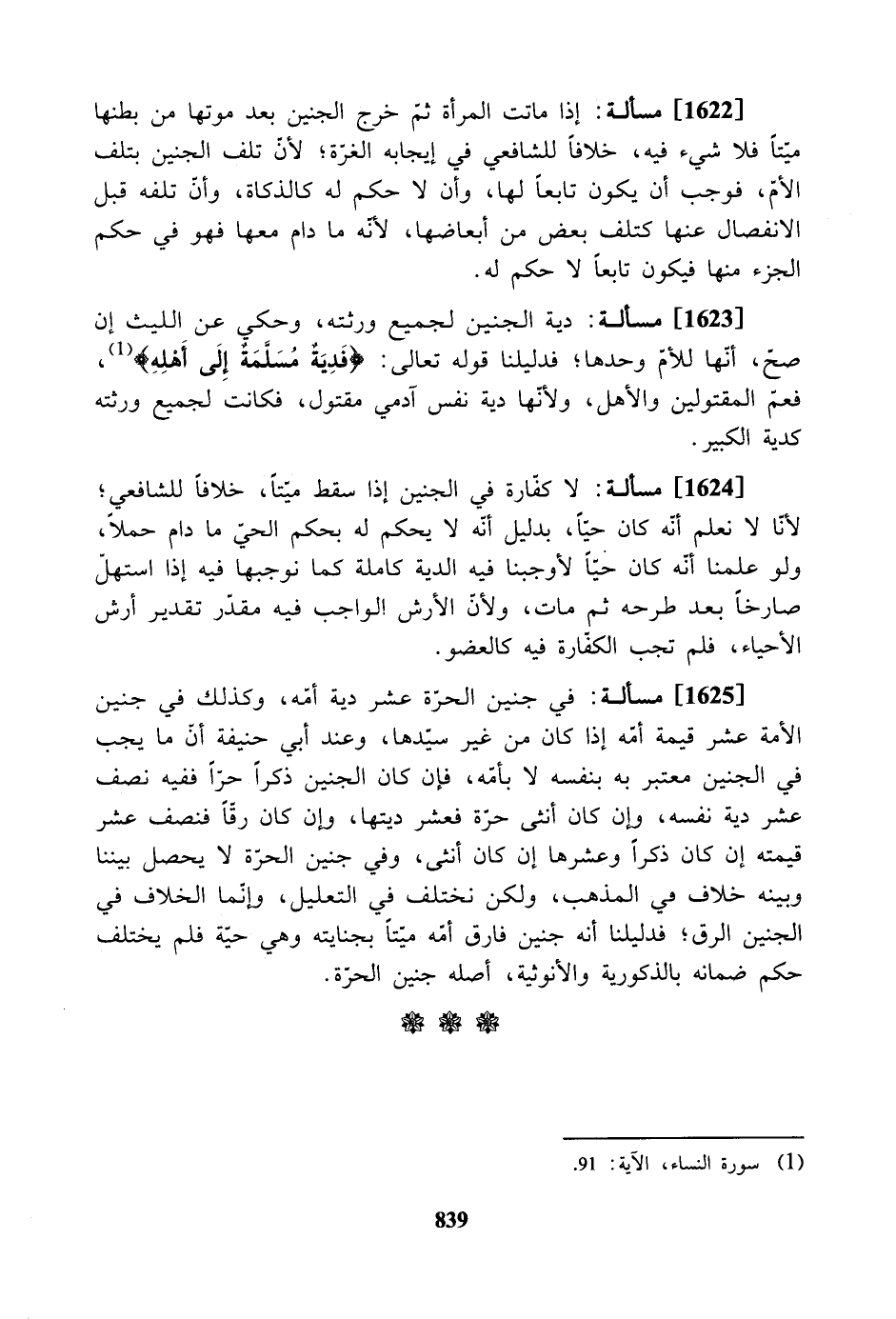 [1623] مسألة: دية الجنين لجميع ورثته، وحكي عن الليث إن صحّ، أنها للأم وحدها؛ فدليلنا قوله تعالى: " فدية مسلمة إلى أهله "، فعم المقتولين والأهل، ولأنها دية نفس آدمي مقتول، فكانت لجميع ورثته كدية الكبير.