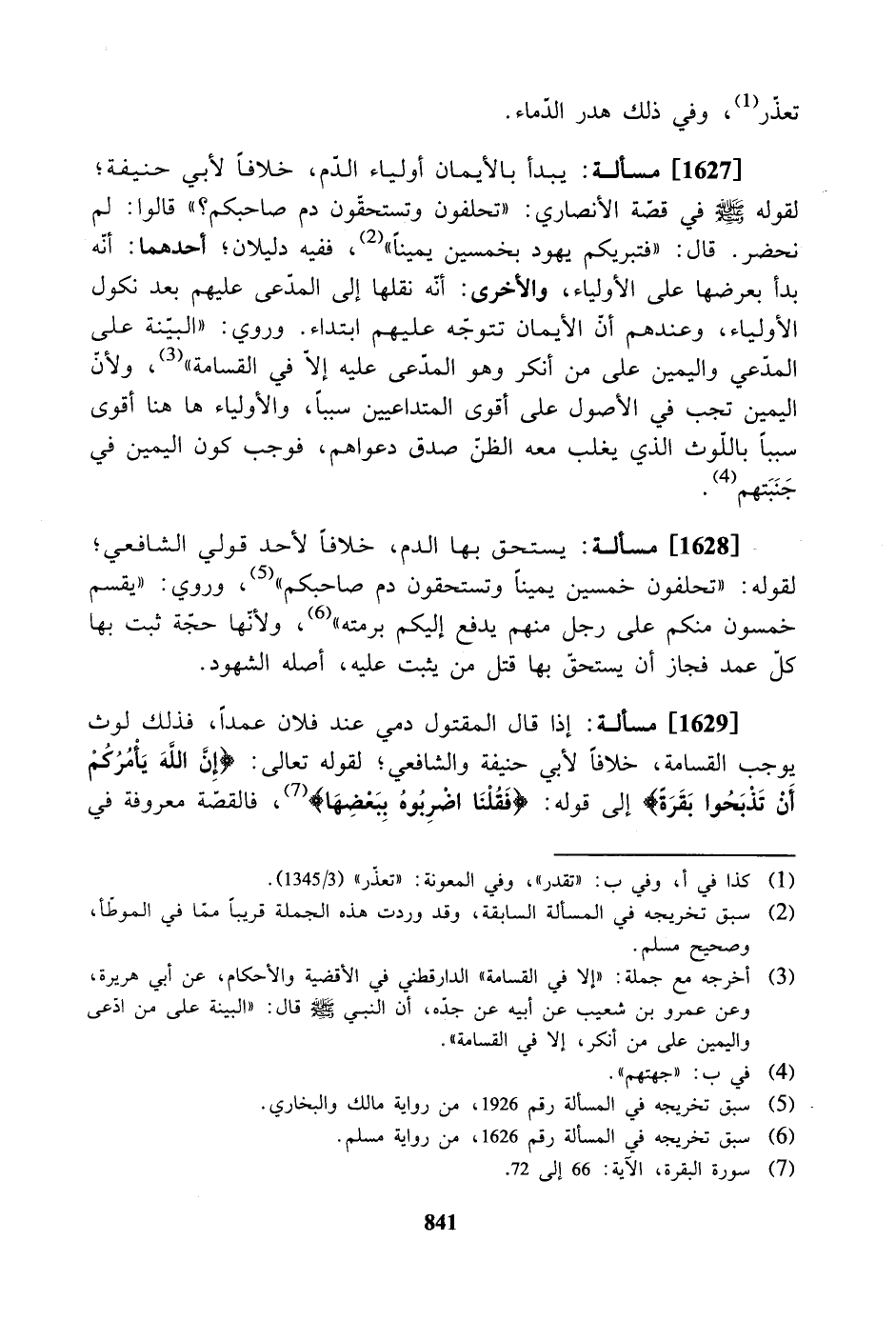 [1627] مسألة: يبدأ بالأيمان أولياء الدّم، خلافاً لأبي حنيفة؛ لقوله صلى الله عليه وسلم في قصة الأنصاري: «تحلفون وتستحقون دم صاحبكم؟» قالوا: لم نحضر. قال: «فتبريكم يهود بخمسين يميناً»، ففيه دليلان؛ أحدهما: أنه بدأ بعرضها على الأولياء، والأخرى: أنّه نقلها إلى المدّعى عليهم بعد نكول الأولياء، وعندهم أن الأيمان تتوجه عليهم ابتداء. وروي: «البينة على المدّعي واليمين على من أنكر وهو المدّعى عليه إلا في القسامة»، ولأن اليمين تجب في الأصول على أقوى المتداعيين سبباً، والأولياء ها هنا أقوى سبباً باللّوث الذي يغلب معه الظن صدق دعواهم، فوجب كون اليمين في جنبتهم.
