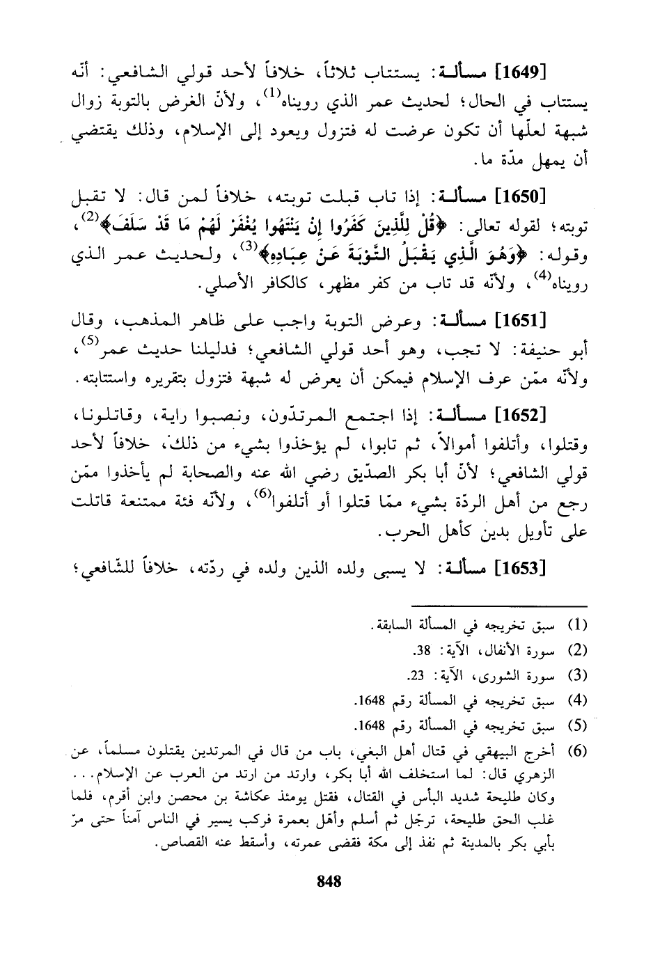 [1649] مسألة: يستتاب ثلاثاً، خلافاً لأحد قولي الشافعي: أنه يستتاب في الحال؛ لحديث عمر الذي رويناه، ولأن الغرض بالتوبة زوال شبهة لعلّها أن تكون عرضت له فتزول ويعود إلى الإسلام، وذلك يقتضي أن يمهل مدّة ما.