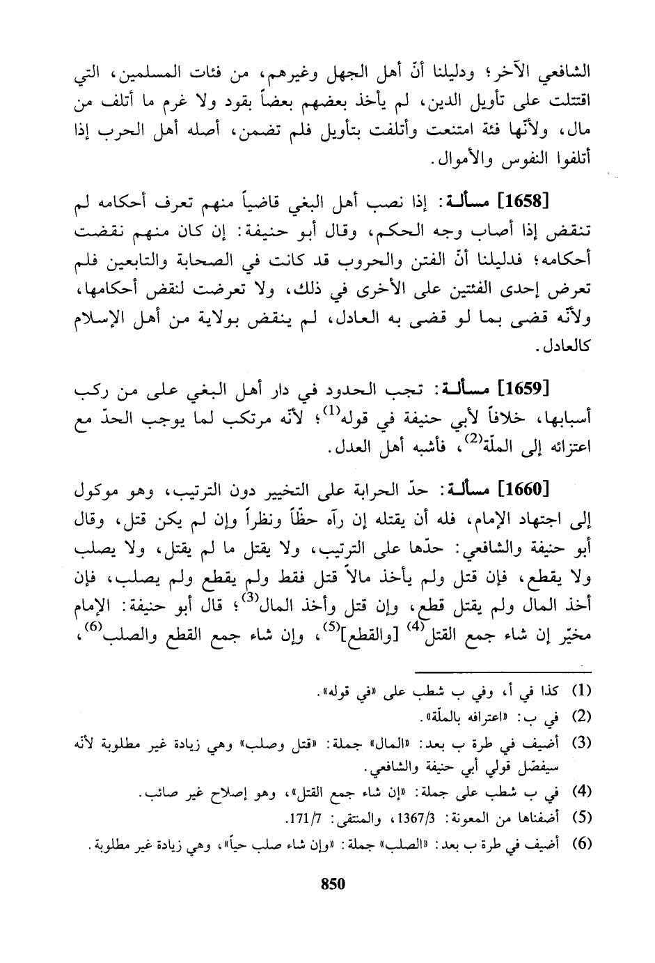 الشافعي الآخر؛ ودليلنا أن أهل الجهل وغيرهم، من فئات المسلمين، التي اقتتلت على تأويل الدين، لم يأخذ بعضهم بعضاً بقود ولا غرم ما أتلف من مال، ولأنها فئة امتنعت وأتلفت بتأويل فلم تضمن، أصله أهل الحرب إذا أتلفوا النفوس والأموال.