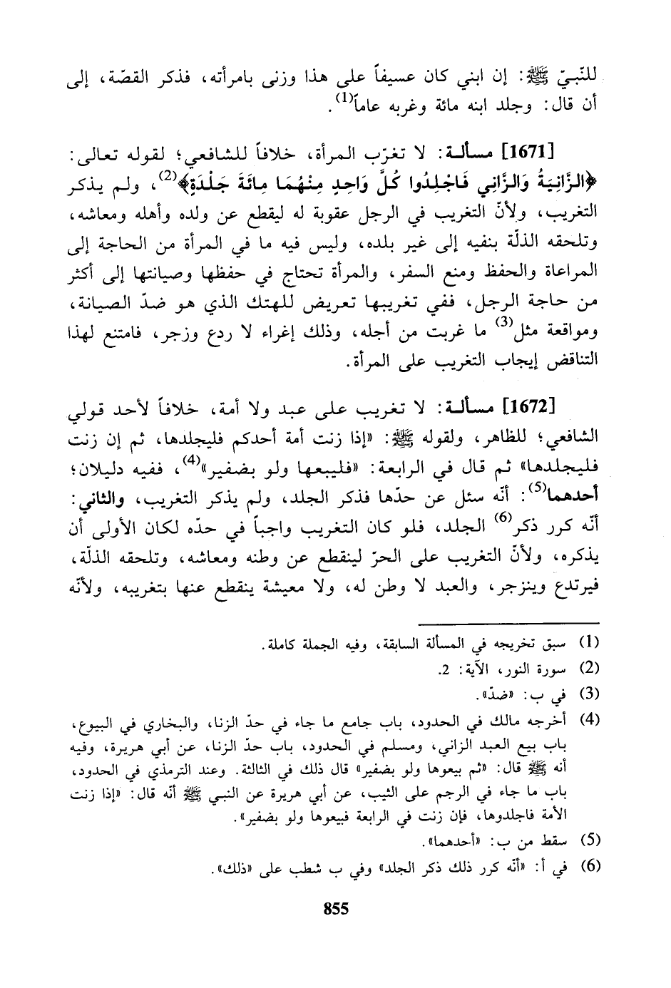[1672] مسألة: لا تغريب على عبد ولا أمة، خلافاً لأحد قولي الشافعي؛ للظاهر، ولقوله صلى الله عليه وسلم: «إذا زنت أمة أحدكم فليجلدها، ثم إن زنت فليجلدها» ثم قال في الرابعة: «فليبعها ولو بضفير»، ففيه دليلان؛ أحدهما: أنه سئل عن حدّها فذكر الجلد، ولم يذكر التغريب، والثاني: أنّه كرر ذكر الجلد، فلو كان التغريب واجباً في حدّه لكان الأولى أن يذكره، ولأن التغريب على الحر لينقطع عن وطنه ومعاشه، وتلحقه الذلة، فيرتدع وينزجر، والعبد لا وطن له، ولا معيشة ينقطع عنها بتغريبه، ولأنه