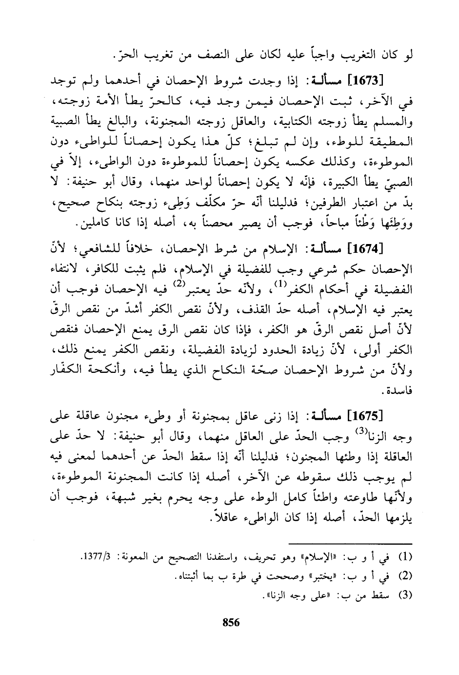 [1674] مسألة: الإسلام من شرط الإحصان، خلافاً للشافعي؛ لأنّ الإحصان حكم شرعي وجب للفضيلة في الإسلام، فلم يثبت للكافر، لانتفاء الفضيلة في أحكام الكفر، ولأنه حدّ يعتبر فيه الإحصان فوجب أن يعتبر فيه الإسلام، أصله حد القذف، ولأنّ نقص الكفر أشدّ من نقص الرق لأن أصل نقص الرق هو الكفر، فإذا كان نقص الرق يمنع الإحصان فنقص الكفر أولى، لأن زيادة الحدود لزيادة الفضيلة، ونقص الكفر يمنع ذلك، ولأن من شروط الإحصان صحة النكاح الذي يطأ فيه، وأنكحة الكفار فاسدة.