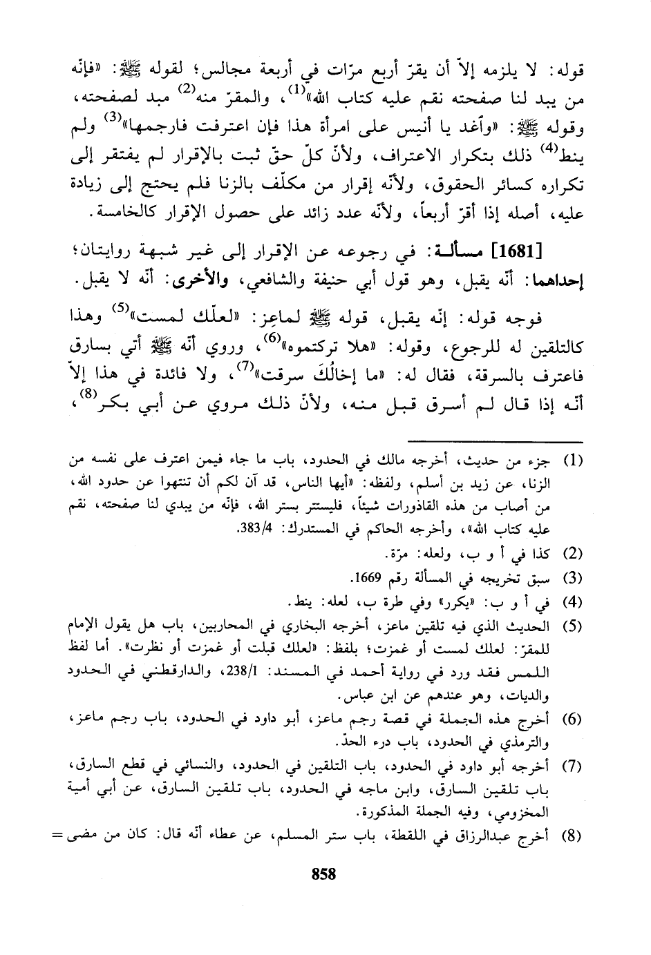 [1681] مسألة: في رجوعه عن الإقرار إلى غير شبهة روايتان؛ إحداهما: أنه يقبل، وهو قول أبي حنيفة والشافعي، والأخرى: أنّه لا يقبل. فوجه قوله: إنّه يقبل، قوله صلى الله عليه وسلم لماعز: «لعلك لمست» وهذا كالتلقين له للرجوع، وقوله: «هلا تركتموه»، وروي أنه صلى الله عليه وسلم أتي بسارق فاعترف بالسرقة، فقال له: «ما إخالك سرقت»، ولا فائدة في هذا إلأ أنّه إذا قال لم أسرق قبل منه، ولأن ذلك مروي عن أبي بكر،