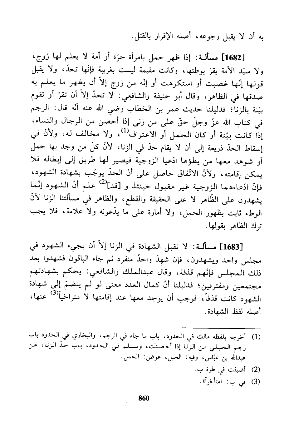 [1682] مسألة: إذا ظهر حمل بامرأة حرة أو أمة لا يعلم لها زوج، ولا سيد الأمة يقر بوطئها، وكانت مقيمة ليست بغريبة فإنها تحدّ، ولا يقبل قولها إنّها غصبت أو استكرهت أو إنّه من زوج إلأ أن يظهر ما يعلم به صدقها في الظاهر، وقال أبو حنيفة والشافعي: لا تحدّ إلا أن تقر أو تقوم بينة بالزنا؛ فدليلنا حديث عمر بن الخطاب رضي الله عنه أنه قال: الرجم في كتاب الله عز وجل حق على من زنى إذا أحصن من الرجال والنساء، إذا كانت بينة أو كان الحمل أو الاعتراف، ولا مخالف له، ولأن في إسقاط الحد ذريعة إلى أن لا يقام حد في الزنا، لأن كل من وجد بها حمل أو شوهد معها من يطؤها ادعيا الزوجية فيصير لها طريق إلى إبطاله فلا يمكن إقامته، ولأن الاتفاق حاصل على أن الحدّ يوجب بشهادة الشهود، فإن ادعاءهما الزوجية غير مقبول حينئذ و [قد] علم أن الشهود إنّما يشهدون على الظاهر لا على الحقيقة والقطع، والظاهر في مسألتنا الزنا لأن الوطء ثابت بظهور الحمل، ولا أمارة على ما يدّعونه ولا علامة، فلا يجب ترك الظاهر بقولها.