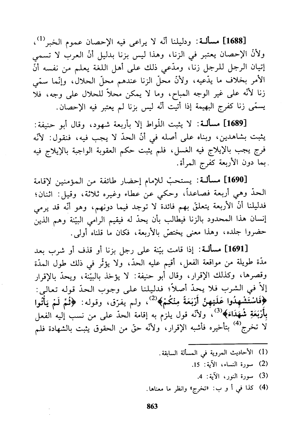 [1691] مسألة: إذا قامت بينة على رجل بزنا أو قذف أو شرب بعد مدّة طويلة من مواقعة الفعل، أقيم عليه الحد، ولا يؤثر في ذلك طول المدّة وقصرها، وكذلك الإقرار، وقال أبو حنيفة: لا يؤخذ بالبينة، ويحد بالإقرار إلا في الشرب فلا يحدّ أصلاً؛ فدليلنا على وجوب الحدّ قوله تعالى: "فاستشهدوا عليهن أربعة منكم"، ولم يفرق، وقوله: "ثم لم يأتوا بأربعة شهداء"، ولأنه قول يلزم به إقامة الحد على من نسب إليه الفعل لا تخرج بتأخيره فأشبه الإقرار، ولأنه حق من الحقوق يثبت بالشهادة فلم
