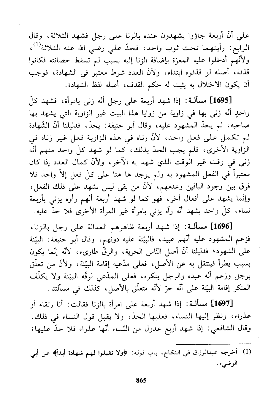 علي أن أربعة جاؤوا يشهدون عنده بالزنا على رجل فشهد الثلاثة، وقال الرابع: رأيتهما تحت ثوب واحد، فحدّ علي رضي الله عنه الثلاثة، ولأنهم أدخلوا عليه المعرة بإضافة الزنا إليه بسبب لم تسقط حصانته فكانوا قذفة، أصله لو قذفوه ابتداء، ولأن العدد شرط معتبر في الشهادة، فوجب أن يكون الاختلال به يثبت له حكم القذف، أصله لفظ الشهادة.