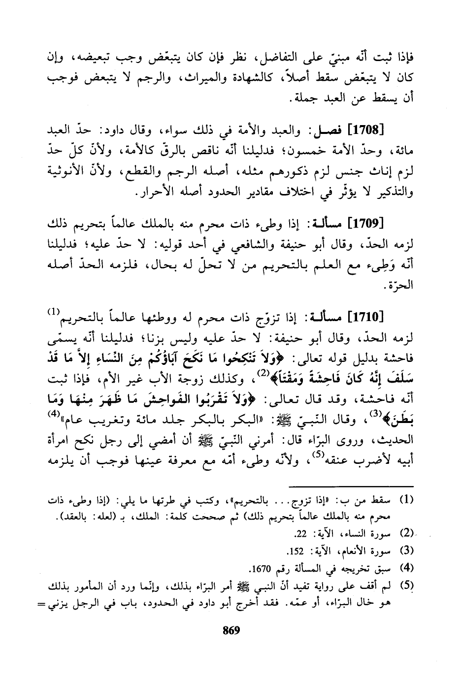 [1710] مسألة: إذا تزوج ذات محرم له ووطئها عالماً بالتحريم لزمه الحدّ، وقال أبو حنيفة: لا حدّ عليه وليس بزنا؛ فدليلنا أنّه يسمّى فاحشة بدليل قوله تعالى: "ولا تتكحوا ما نكح آباؤكم من النساء إلا ما قد سلف إنه كان فاحشة ومقتاً"، وكذلك زوجة الأب غير الأم، فإذا ثبت أنه فاحشة، وقد قال تعالى: "ولا تقربوا الفواحش ما ظهر منها وما بطن"، وقال النبي صلى الله عليه وسلم: «البكر بالبكر جلد مائة وتغريب عام» الحديث، وروى البراء قال: أمرني النبي صلى الله عليه وسلم أن أمضي إلى رجل نكح امرأة أبيه لأضرب عنقه، ولأنه وطىء أمه مع معرفة عينها فوجب أن يلزمه