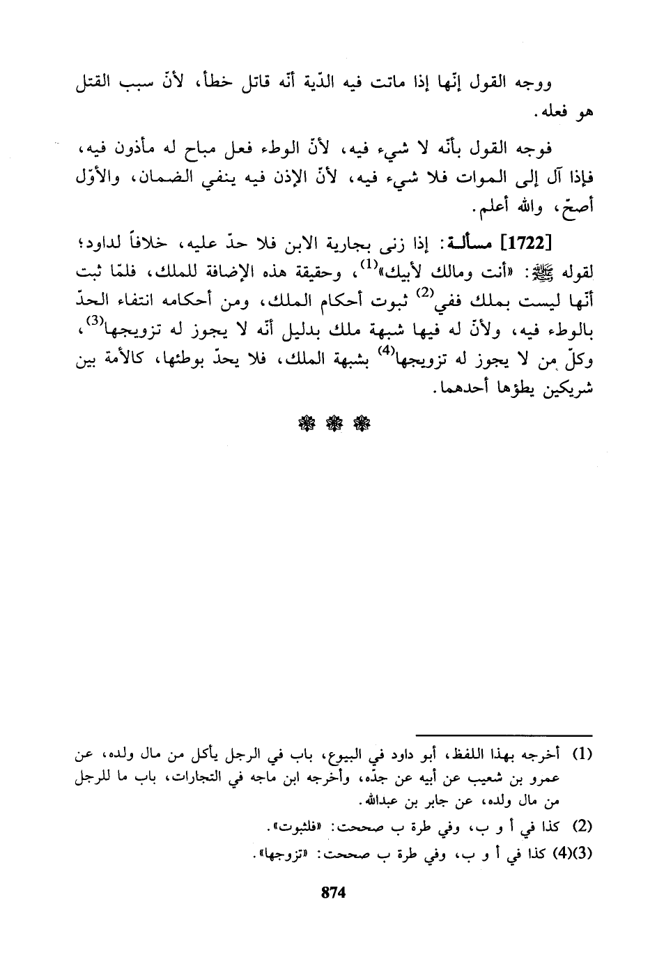 [1722] مسألة: إذا زنى بجارية الابن فلا حدّ عليه، خلافاً لداود؛ لقوله صلى الله عليه وسلم: «أنت ومالك لأبيك»، وحقيقة هذه الإضافة للملك، فلمّا ثبت أنّها ليست بملك ففي ثبوت أحكام الملك، ومن أحكامه انتفاء الحدّ بالوطء فيه، ولأن له فيها شبهة ملك بدليل أنه لا يجوز له تزويجها، وكل من لا يجوز له تزويجها بشبهة الملك، فلا يحدّ بوطئها، كالأمة بين شريكين يطؤها أحدهما.