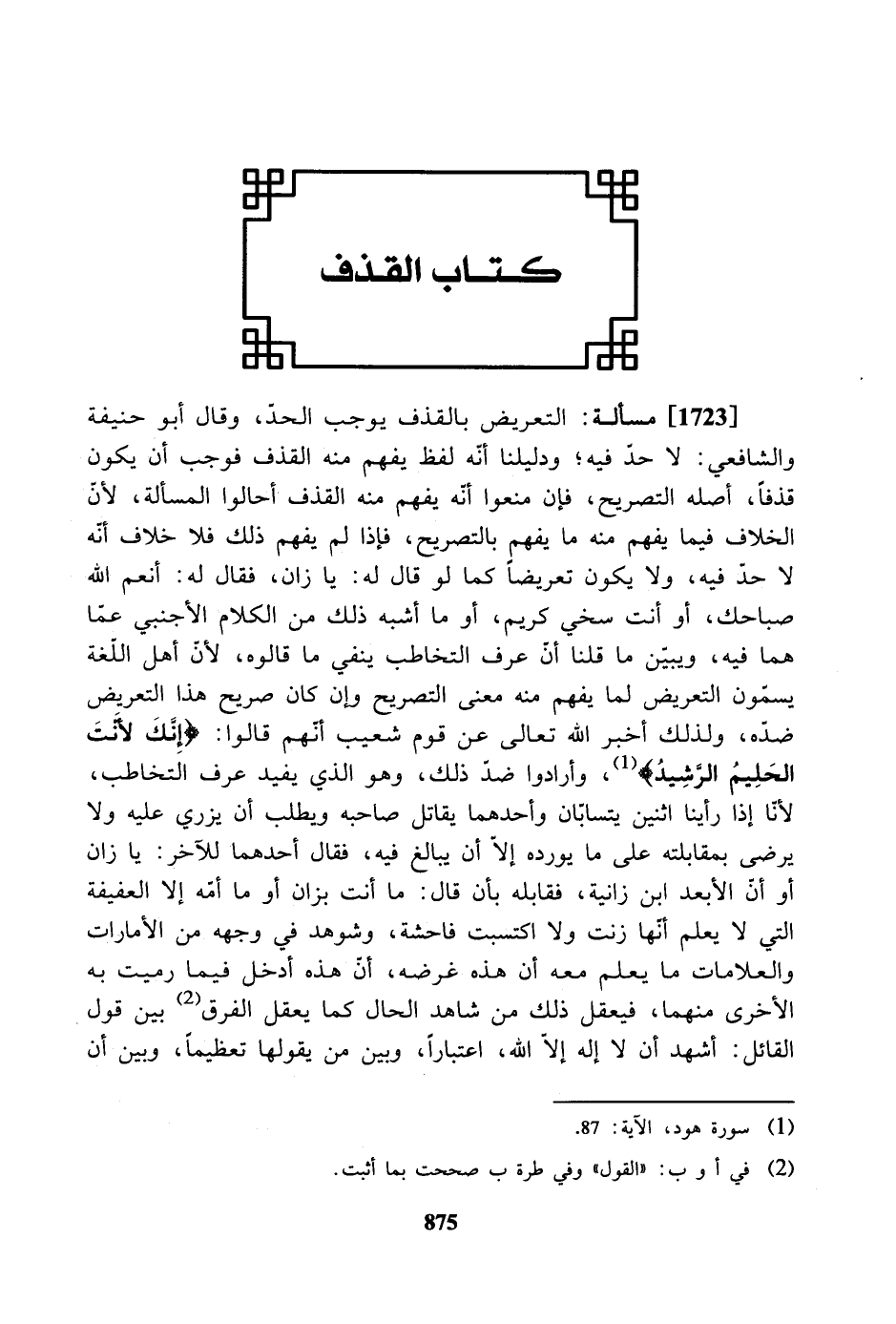 [1723] مسألة: التعريض بالقذف يوجب الحدّ، وقال أبو حنيفة والشافعي: لا حد فيه؛ ودليلنا أنه لفظ يفهم منه القذف فوجب أن يكون قذفاً، أصله التصريح، فإن منعوا أنّه يفهم منه القذف أحالوا المسألة، لأنّ الخلاف فيما يفهم منه ما يفهم بالتصريح، فإذا لم يفهم ذلك فلا خلاف أنه لا حد فيه، ولا يكون تعريضاً كما لو قال له: يا زان، فقال له: أنعم الله صباحك، أو أنت سخي كريم، أو ما أشبه ذلك من الكلام الأجنبي عمّا هما فيه، ويبين ما قلنا أن عرف التخاطب ينفي ما قالوه، لأن أهل اللّغة يسمّون التعريض لما يفهم منه معنى التصريح وإن كان صريح هذا التعريض ضدّه، ولذلك أخبر الله تعالى عن قوم شعيب أنهم قالوا: "إنك لأنت الحليم الرشيد"، وأرادوا ضدّ ذلك، وهو الذي يفيد عرف التخاطب، لأنا إذا رأينا اثنين يتسابان وأحدهما يقاتل صاحبه ويطلب أن يزري عليه ولا يرضى بمقابلته على ما يورده إلا أن يبالغ فيه، فقال أحدهما للآخر: يا زان أو أن الأبعد ابن زانية، فقابله بأن قال: ما أنت بزان أو ما أمه إلا العفيفة التي لا يعلم أنها زنت ولا اكتسبت فاحشة، وشوهد في وجهه من الأمارات والعلامات ما يعلم معه أن هذه غرضه، أن هذه أدخل فيما رميت به الأخرى منهما، فيعقل ذلك من شاهد الحال كما يعقل الفرق بين قول القائل: أشهد أن لا إله إلا الله، اعتبارًا، وبين من يقولها تعظيمًا، وبين أن